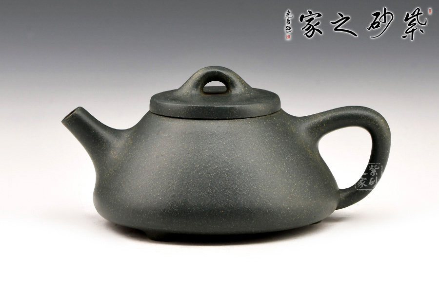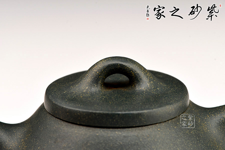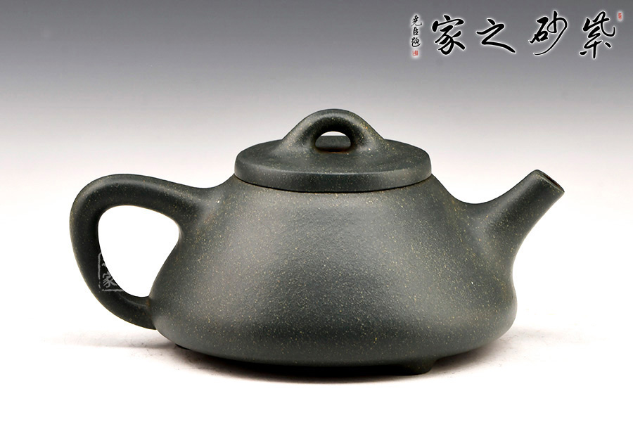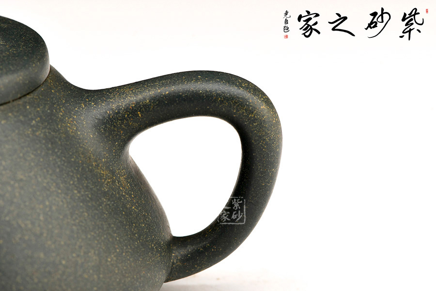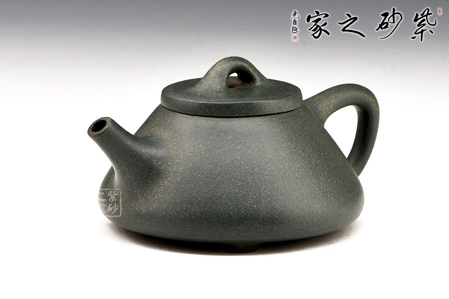 小石瓢形制周正。壺身飽滿瑩潤(rùn),以幾何三角造型,蘊(yùn)一壺清奇脫俗;長(zhǎng)直炮嘴、倒三角把,橋型鈕,以簡(jiǎn)單、凝練的線條恣意揮灑,張弛有度、搭配得宜。底三小足撐開,穩(wěn)實(shí)有力。整體比例協(xié)調(diào),做工精細(xì)。原礦綠泥制作,清秀雅致。