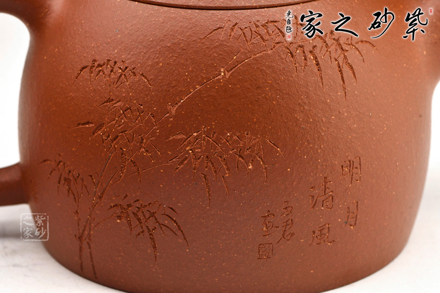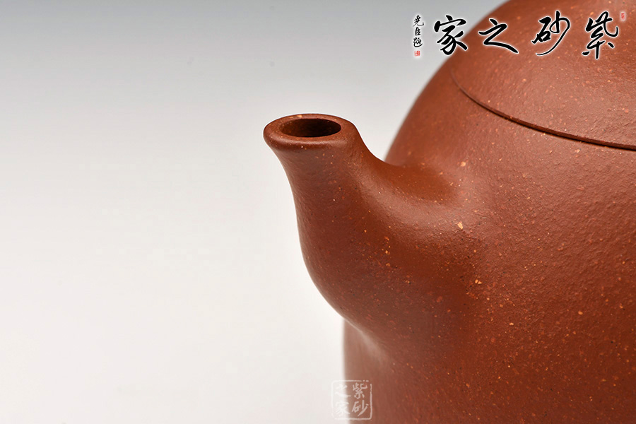 壺身挺拔由下至上收斂,天然流通;壺嘴粗出細收,向上翹起;倒耳型彎曲有致,重心下移;截蓋鼓起;經(jīng)典橋型鈕。