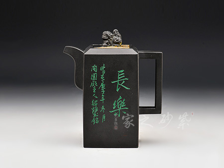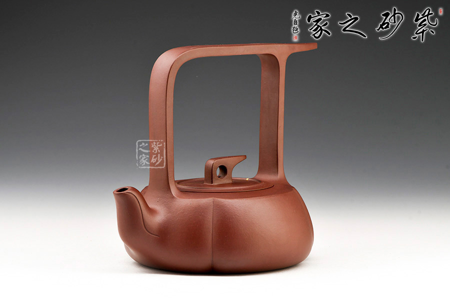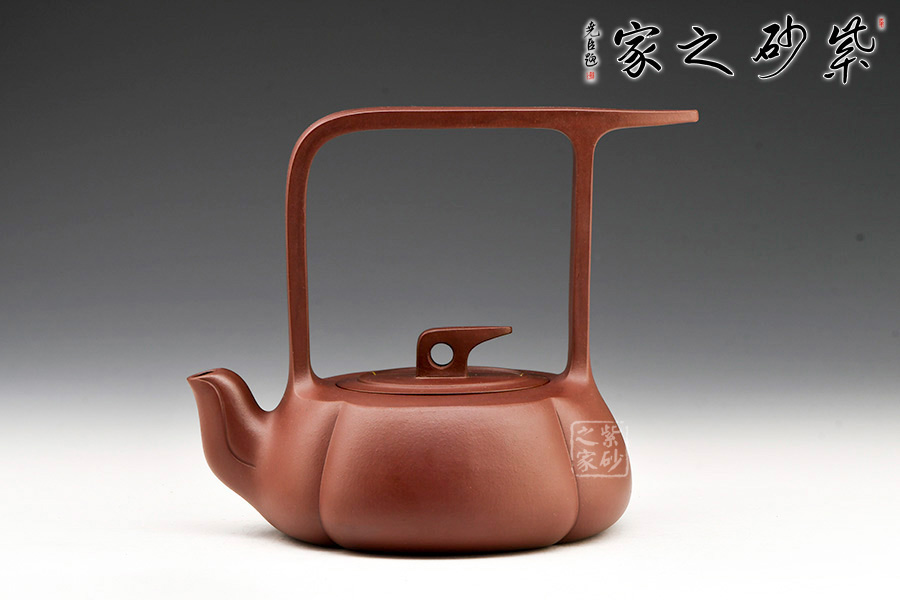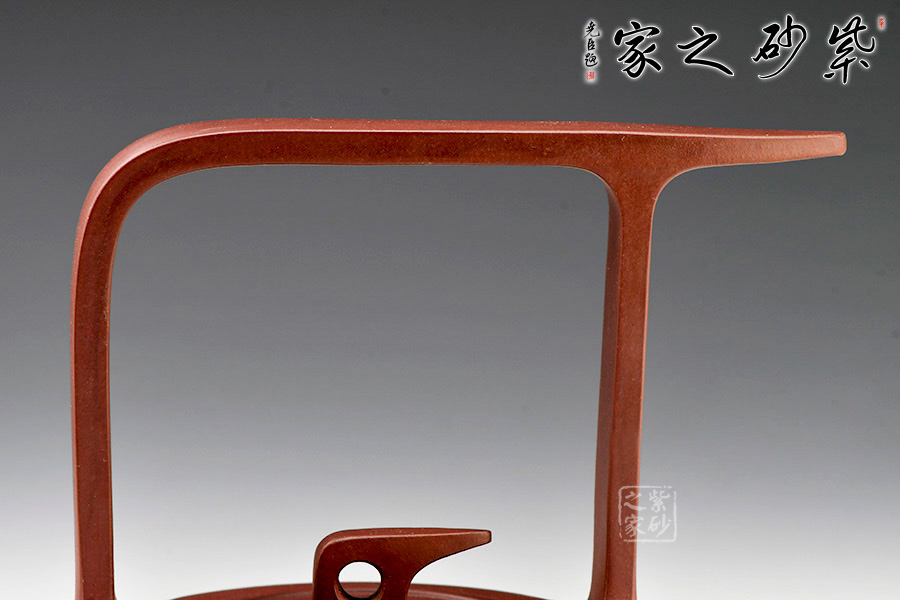 直線與弧線交錯(cuò)運(yùn)用,轉(zhuǎn)折處明快流利。提梁及蓋的造型設(shè)計(jì)突出,形成方中有方、方中帶圓、圓中含方的構(gòu)圖,充分掌握雕塑與空間關(guān)系的美學(xué)概念。