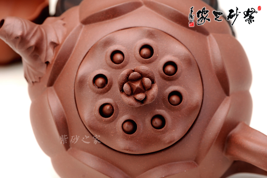 壺蓋為蓮蓬造型,一圈八粒蓮孔規(guī)整排列,嵌蓋與壺身渾然一體,恰到好處。