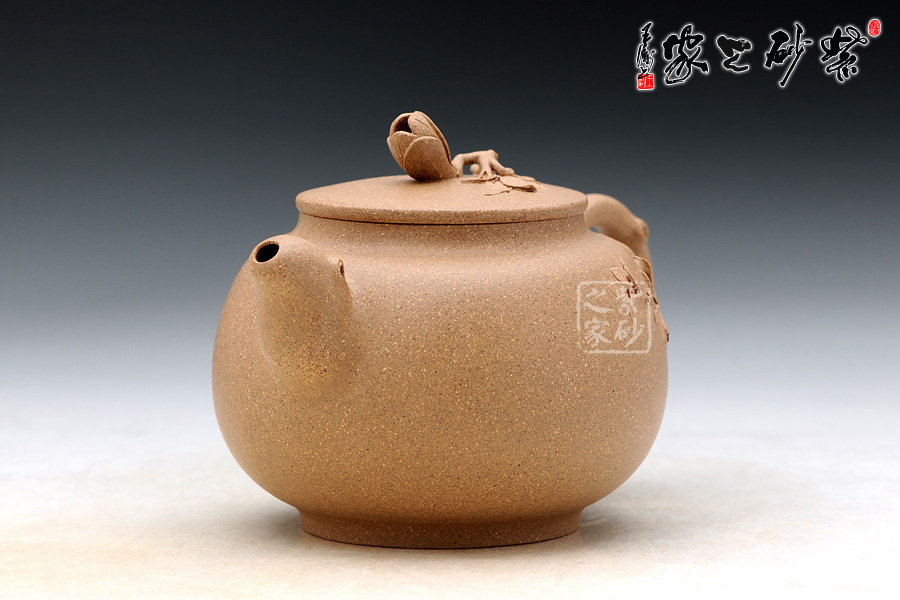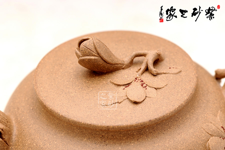 壺柄自壺身底部胥出,向上蜷曲成壺把,同時在銜接的地方生出細(xì)嫩的花枝來,玉蘭花開滿壺身,紅泥做瓣,段泥做蕊,溫婉迷人。花蕊更與壺身上閃閃的金砂相呼應(yīng),真不知到底是哪是金砂,哪是花蕊了……