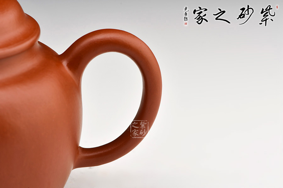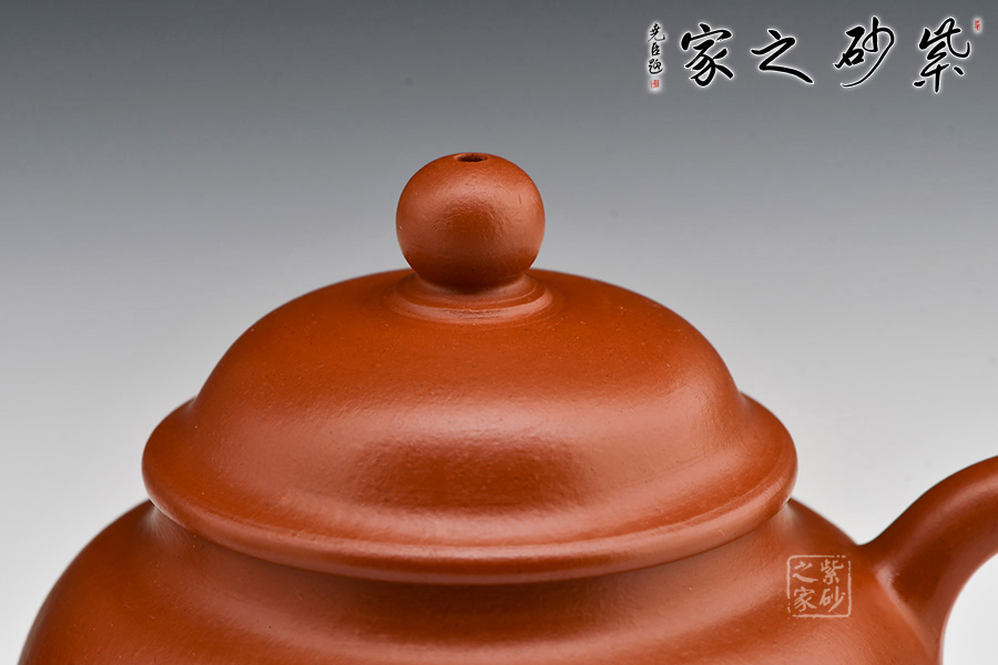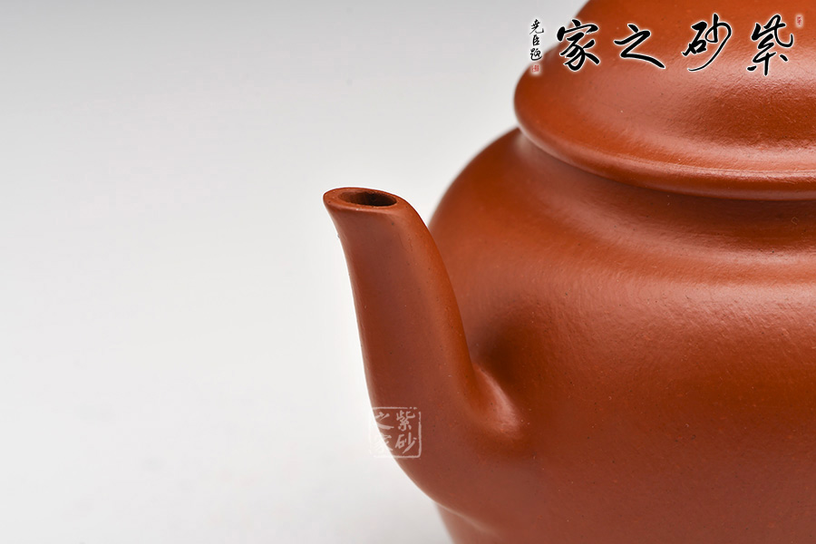 圓壺身,十分飽滿,平實(shí)穩(wěn)重;平肩高頸,壓蓋式,對(duì)接嚴(yán)絲合縫,蓋面鼓起,圓潤的壺鈕如一粒佛珠,亭亭佇立 ;彎嘴暗接精湛,出水利落干脆;耳形端把,弧度流暢緩和,端握舒適。