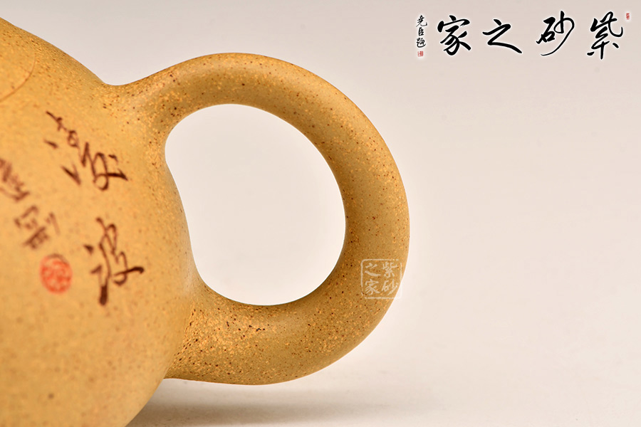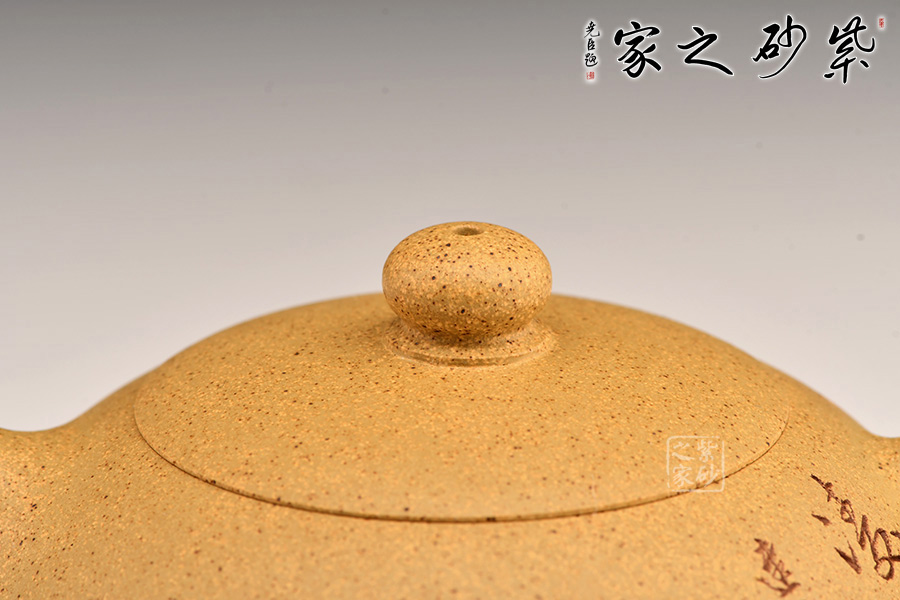 扁西施自有一份圓潤和憨態(tài)。短小挺翹的壺嘴,細出粗收的環(huán)把,圓潤飽滿的壺身,截蓋,扁球形的壺鈕。造型看似簡約,實則嚴謹,好似渾然天成,使人心生喜意,愛不釋手。