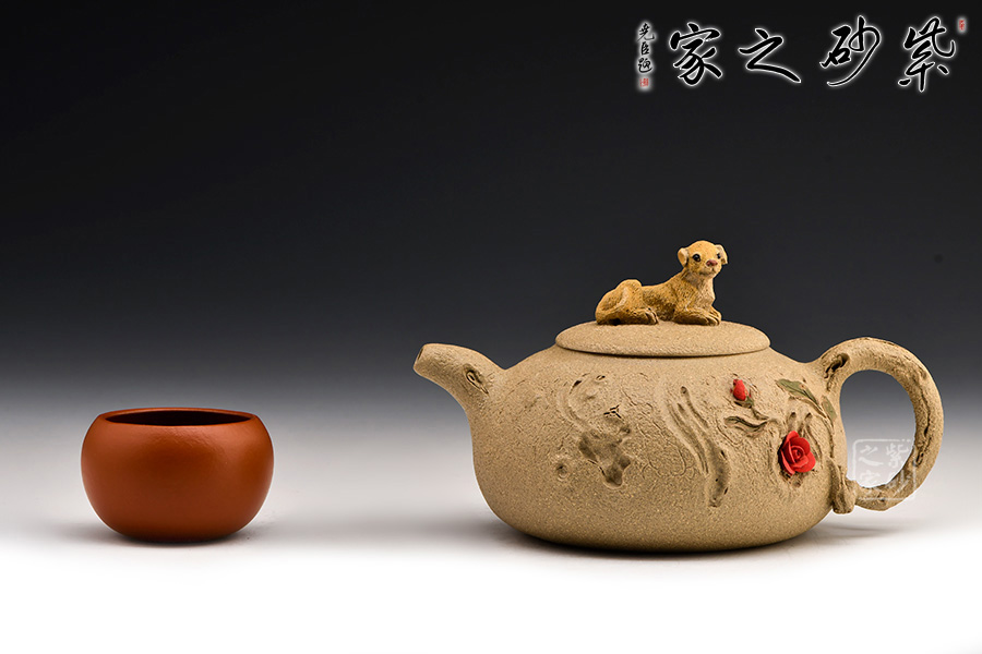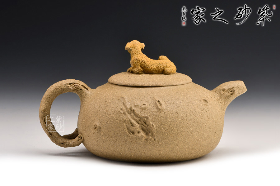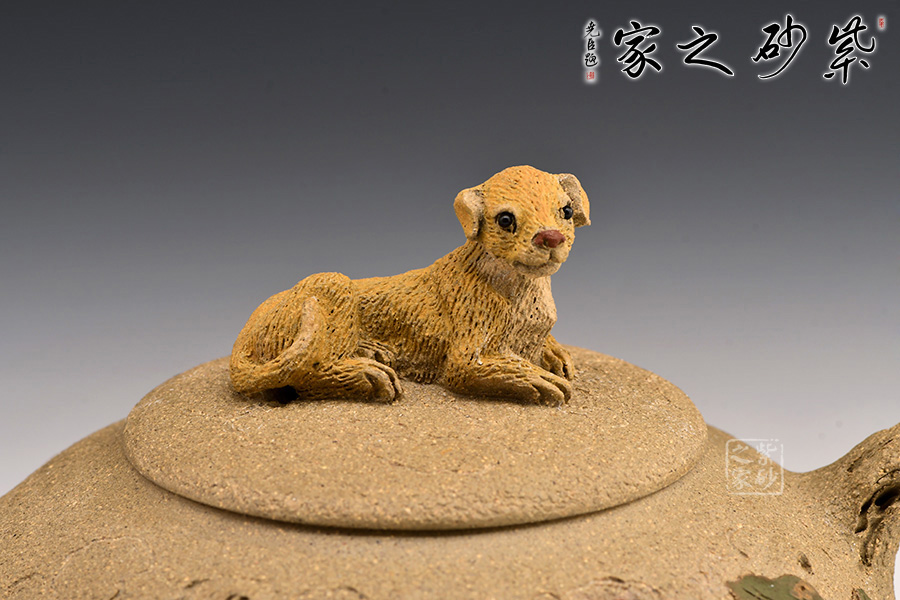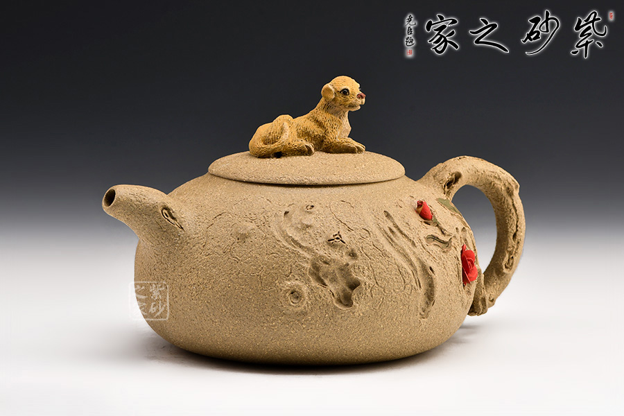 此壺以十二生肖中的狗為壺鈕,生動形象,活靈活現(xiàn)。壺身圓潤,有凹點、溝壑點綴其上,營造出滄桑的樹皮質(zhì)感。枝干作壺嘴和壺把:彎嘴出水暢快,圓把彎曲有力。令人嘖嘖稱奇之處在于把一側(cè)胥出枝丫,長出嫩葉,開出紅花?;ǘ鋴赡燮G麗,栩栩如生,奪人眼球。不得不感嘆倪順金老師實在構(gòu)思巧妙!