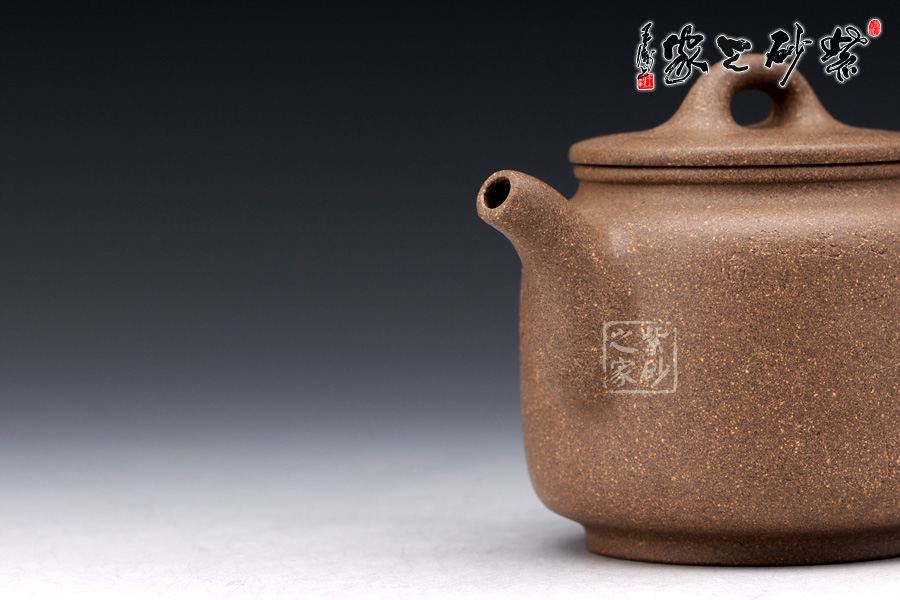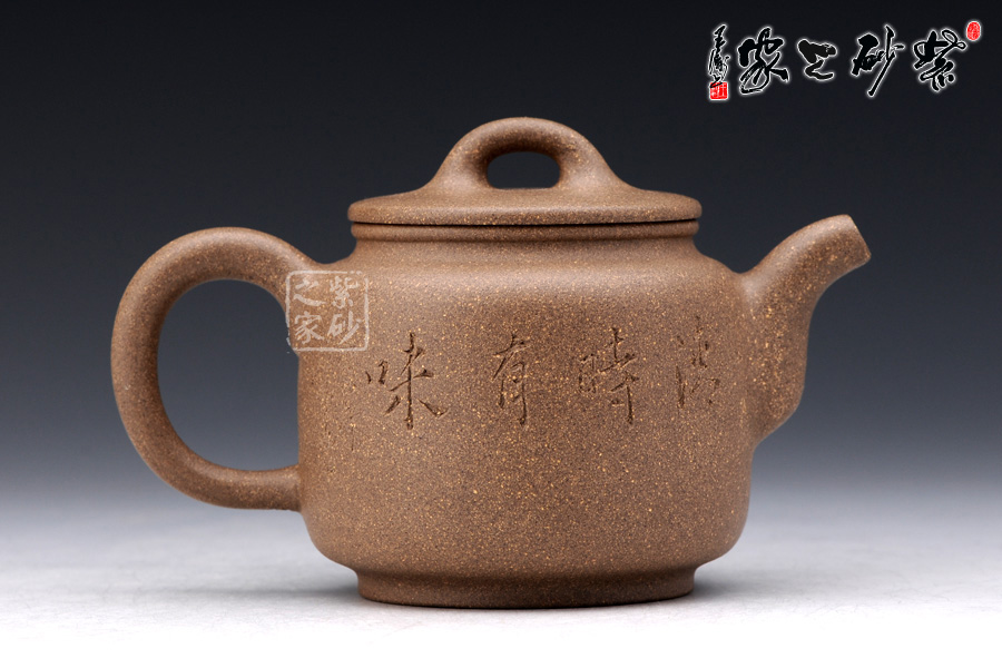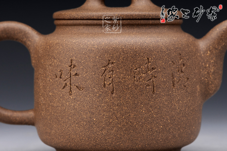 此壺乃潘國良老師的杰作,橋形壺鈕,卵狀鈕孔,平蓋,自壺鈕處兩條曲線緩慢落下,壺肩微削,三彎嘴蜿蜒而出,橢圓形壺把;整個壺形線條流暢優(yōu)美,猶如一位身著水袖舞蹈的古典美女,壺嘴似一條水袖噴薄而出,壺把則是另一條胳膊輕輕叉于腰間,姿態(tài)婀娜萬千……壺體上雕刻精細逼真,“清時有味”四個字規(guī)整有力;老段泥制作,砂質(zhì)細膩,壺蓋嚴密,壺身小巧可愛,煞是喜人,是送人的佳品。
