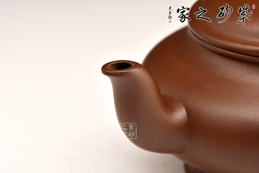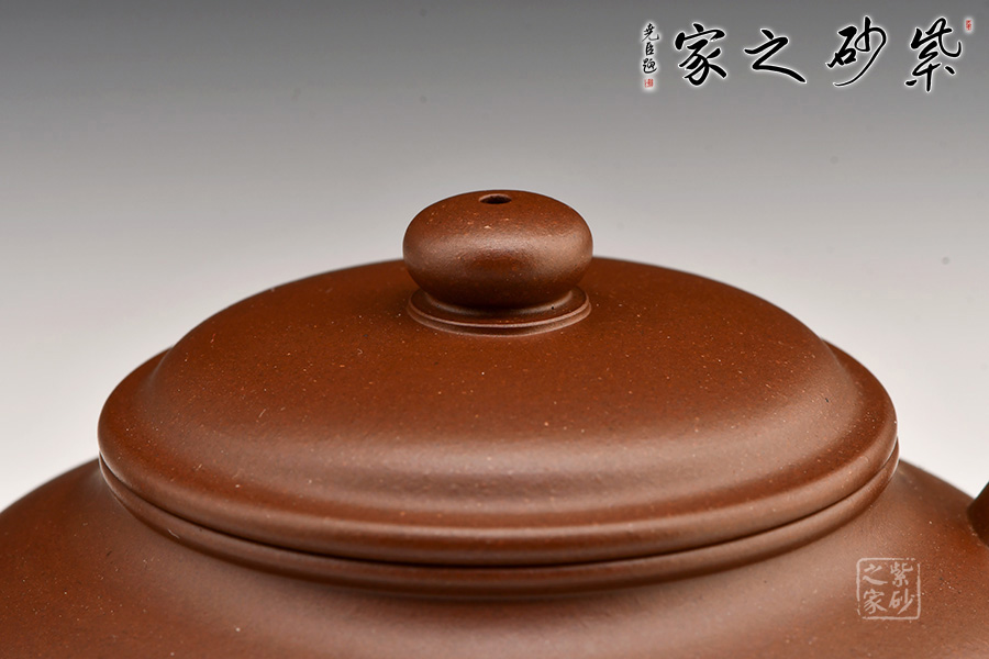 整壺壺體扁而不塌,制作難度較高。壺腹寬大,扁如玉璧,流、把舒展流暢,壺流自壺腹彎曲而出,壺把自壺腹上彎至壺腹下端,與流相呼應(yīng),使得扁腹向左右延伸,有曲張之勢(shì)。壺肩平坦,蓋邊線略強(qiáng)于口線,正合國(guó)人天蓋地之理念。扁圓蓋,扁圓鈕,視覺(jué)觀感上佳。