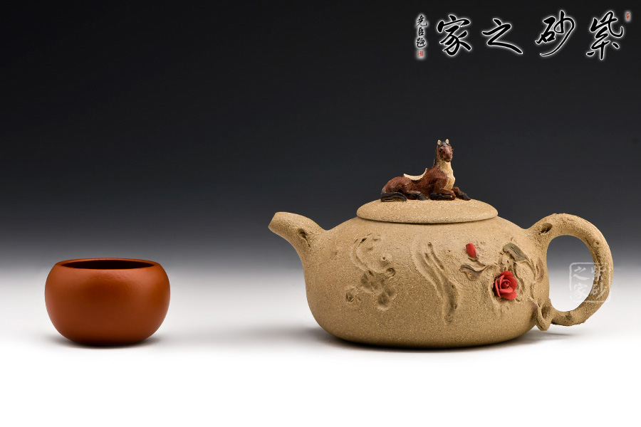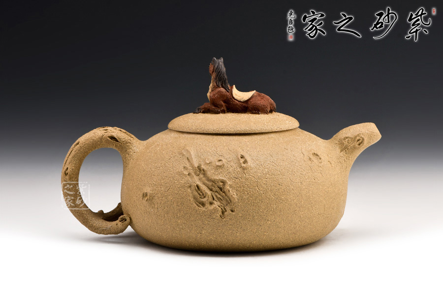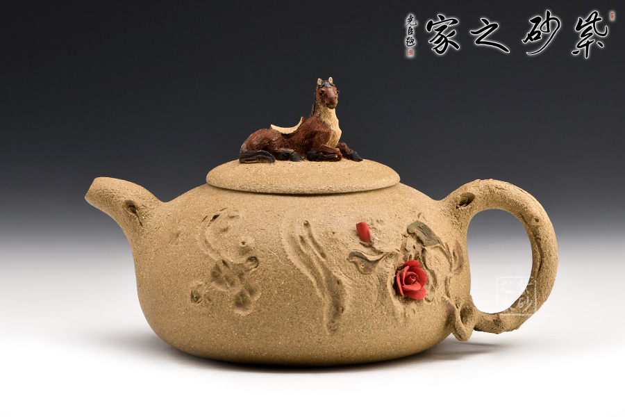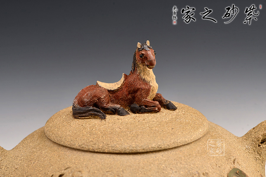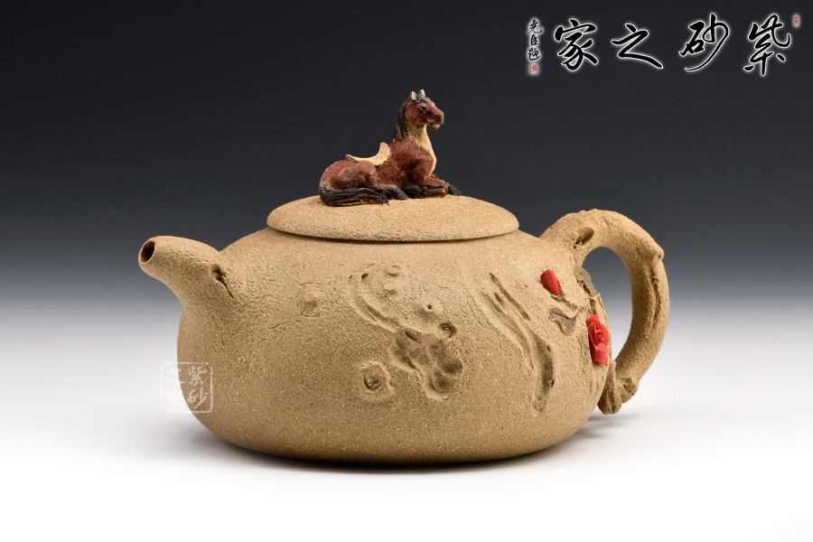 此壺以十二生肖中的馬為壺鈕,生動(dòng)形象,活靈活現(xiàn)。壺身圓潤(rùn),有凹點(diǎn)、溝壑點(diǎn)綴其上,營(yíng)造出滄桑的樹(shù)皮質(zhì)感。枝干作壺嘴和壺把:彎嘴出水暢快,圓把彎曲有力。令人嘖嘖稱奇之處在于把一側(cè)胥出枝丫,長(zhǎng)出嫩葉,開(kāi)出紅花?;ǘ鋴赡燮G麗,栩栩如生,奪人眼球。不得不感嘆倪順金老師實(shí)在構(gòu)思巧妙!