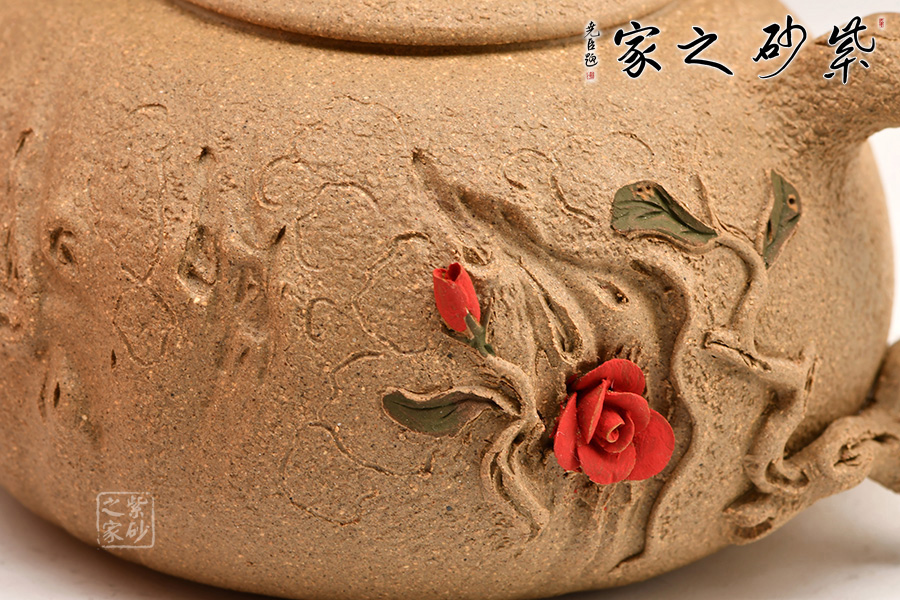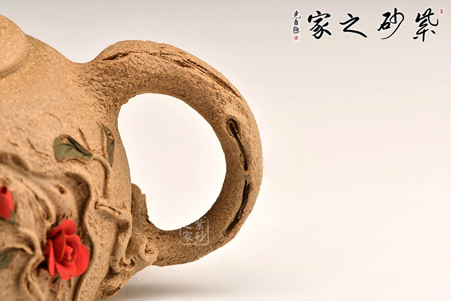 金蟾為鈕,生動形象,活靈活現(xiàn)。壺身圓潤,有凹點(diǎn)、溝壑點(diǎn)綴其上,營造出滄桑的樹皮質(zhì)感。枝干作壺嘴和壺把:彎嘴出水暢快,圓把彎曲有力。令人嘖嘖稱奇之處在于把一側(cè)胥出枝丫,長出嫩葉,開出紅花。花朵嬌嫩艷麗,栩栩如生,奪人眼球。不得不感嘆張菊仙老師的妙手生花!