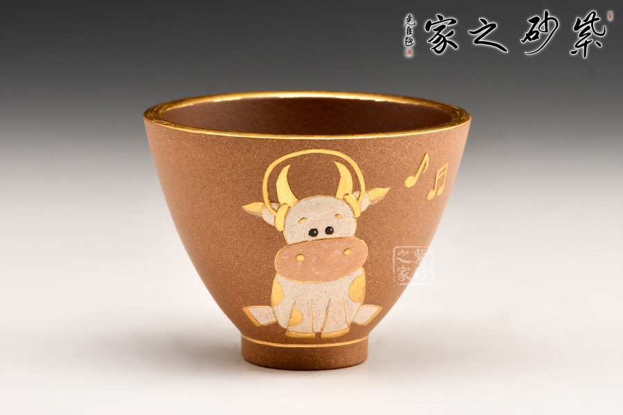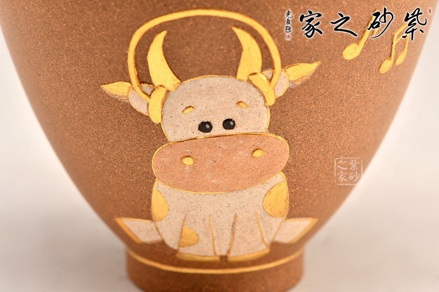 小金牛萌萌杯,原礦段泥制作。杯底高度適中,方便拿捏。杯身由圓形徐徐向上展開,如金鐘倒放。杯口鑲一圈金邊。壺身裝飾如名字一樣可愛。泥繪一只小金牛帶著耳機聽音樂,美妙旋律溢出,牛仿佛也要隨著音樂起舞,憨態(tài)十足。