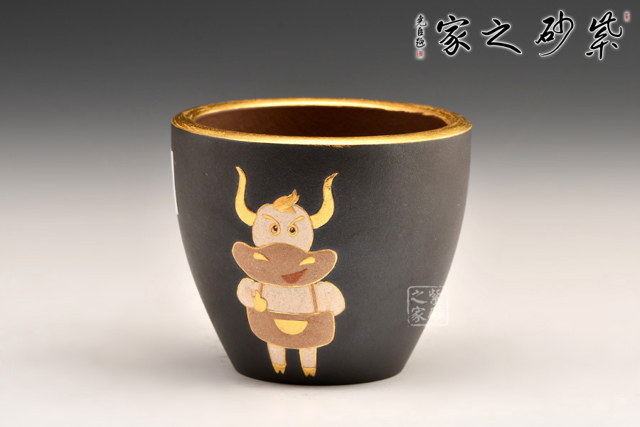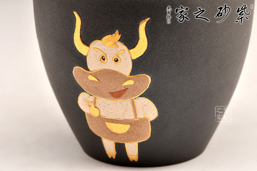 小金牛萌萌杯,黑泥制作,杯底平坦。杯身由圓形徐徐向上展開,如金鐘倒放。杯口鑲一圈金邊。壺身裝飾如名字一樣可愛。泥繪一只小金牛比個(gè)點(diǎn)贊手勢(shì),表情萌萌,憨態(tài)十足,頗具人性。