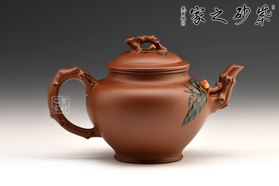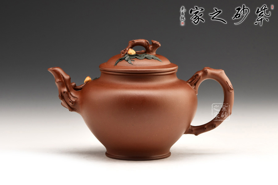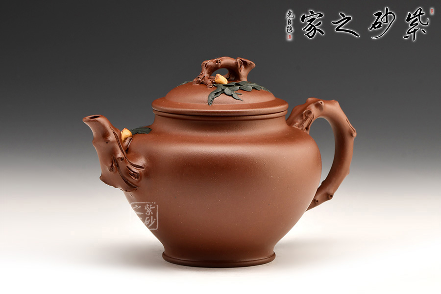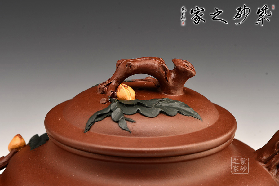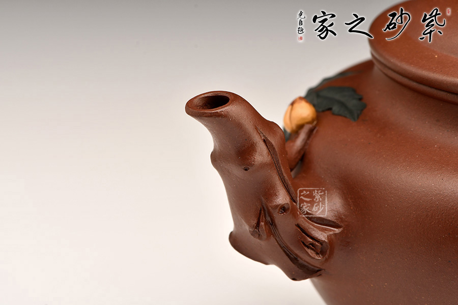 最為令人驚嘆之處在于壺鈕、壺流處采用雙色拼接,金黃的壽桃和碧綠的桃葉自桃枝間伸出,精雕細(xì)作,使壺的造型更加生動(dòng)、形象、活潑,充滿生機(jī)與活力。