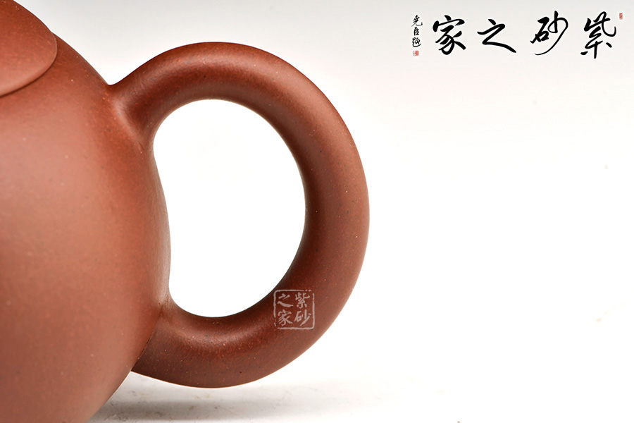 壺流與把和諧對稱。壺把上小下大,上薄下厚,自然流暢。