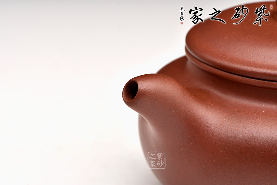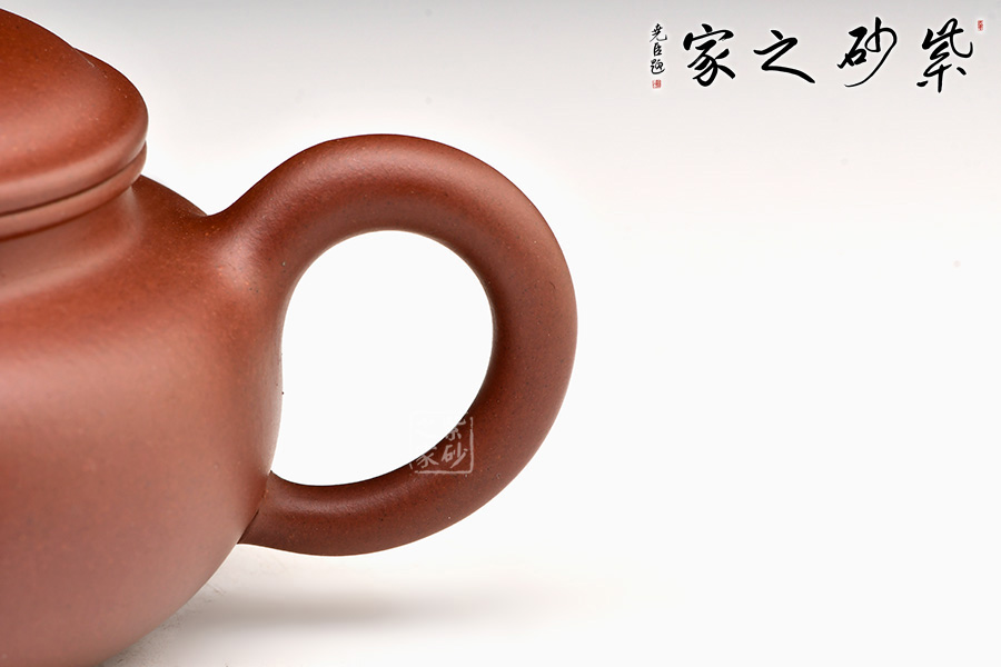 翟葉君老師所制仿古壺,壺腹略飽滿,平肩,壺蓋與口沿子母線吻合嚴(yán)密,壺鈕圓潤,如一顆佛珠般正立于蓋中心,凸顯高貴典雅;一彎流胥出自然,耳形端把彎曲有致。整器骨肉亭勻、剛?cè)嵯酀?、過渡自然、收展有度。