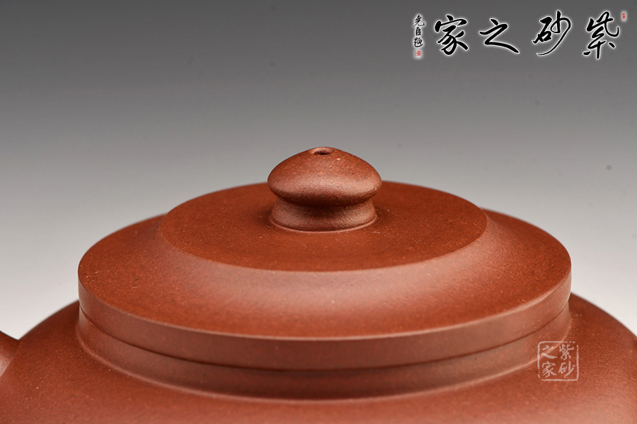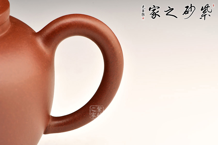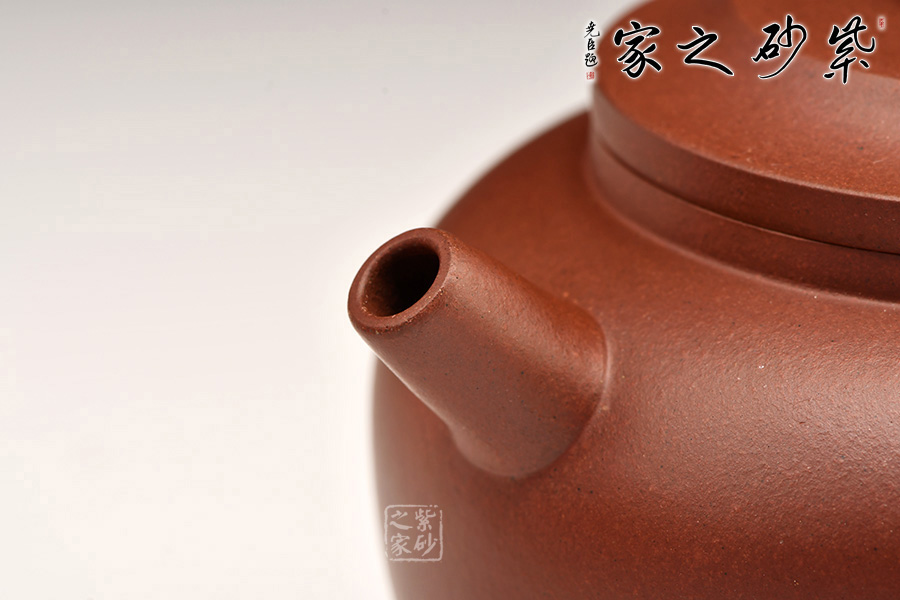 巨輪壺光潔素面,壺型簡潔。壺身圓潤而敦厚,口蓋相壓成平蓋,蓋面斜坡又起一平面。蘑菇形壺鈕提捏方便。炮管流,出水有力,水流如柱,氣勢磅礴,暴爽!耳形把拿捏舒適。