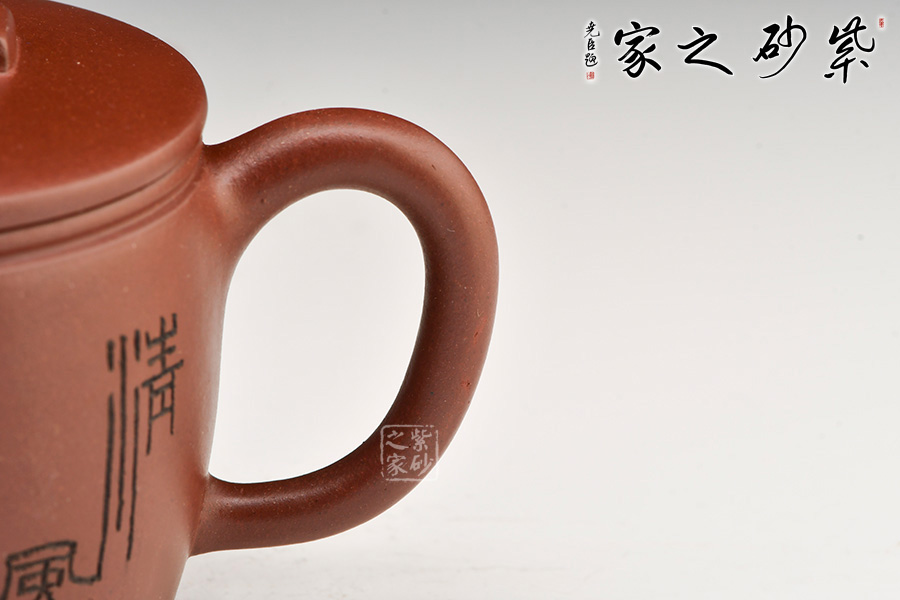 圓筒形壺體,上侈下教,蓋平略見(jiàn)弧,橋式鈕,圈足底,壺嘴圓口,出水流暢,耳型把,彎曲有度。