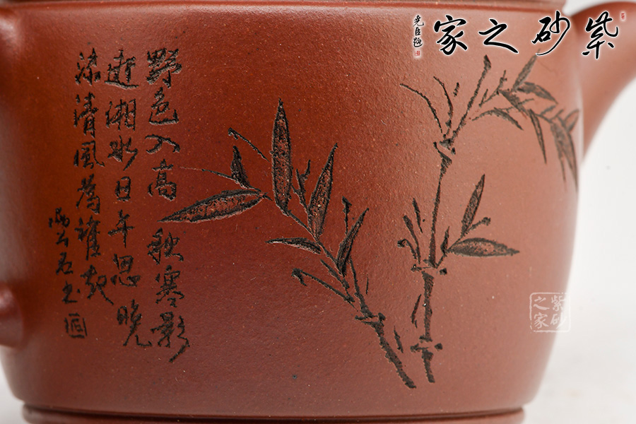 此壺正面下筆“情風(fēng)”兩個(gè)大字,瀟灑不羈;背面繪刻“竹枝”畫(huà)一幅,可見(jiàn)風(fēng)骨。