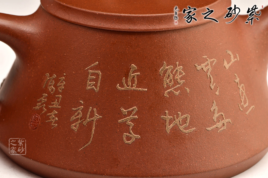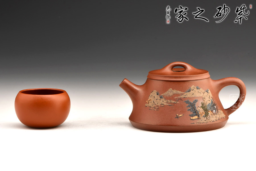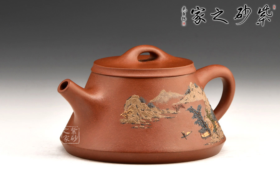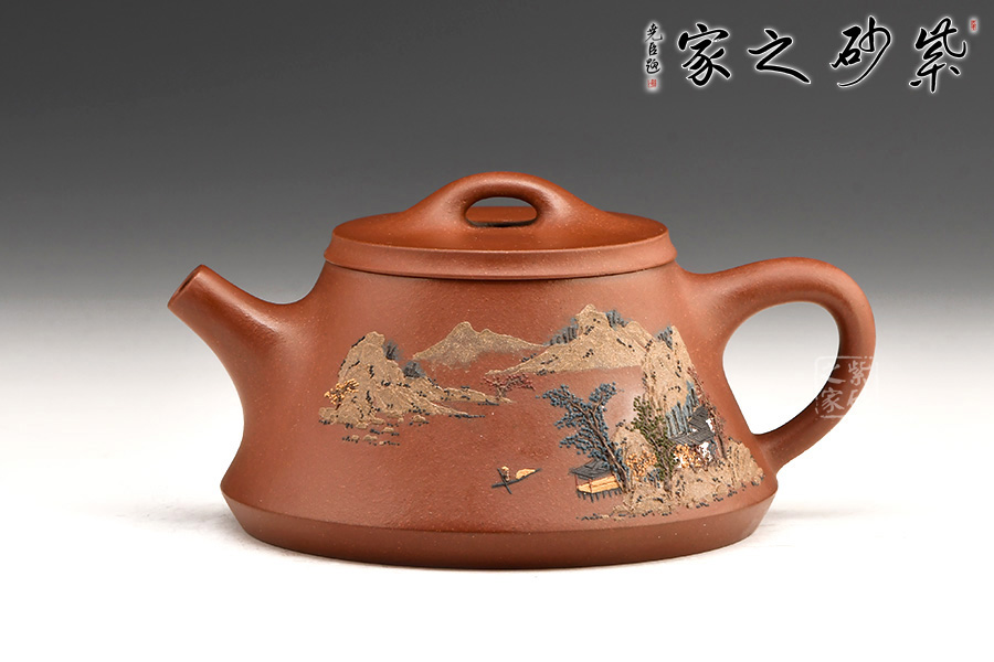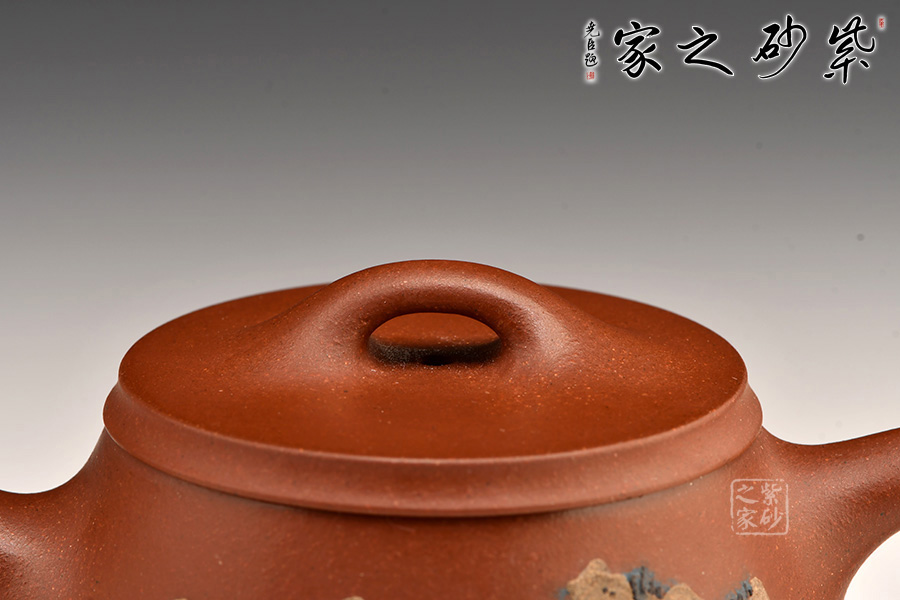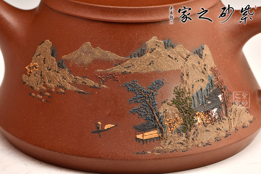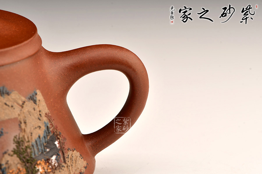此壺充分把握住石瓢壺的精髓之處,加上老師自己的創(chuàng)新,將壺底三足改為棱線平底,穩(wěn)重大氣質(zhì)感。壺身泥繪江南水鄉(xiāng)之景,更添意境。