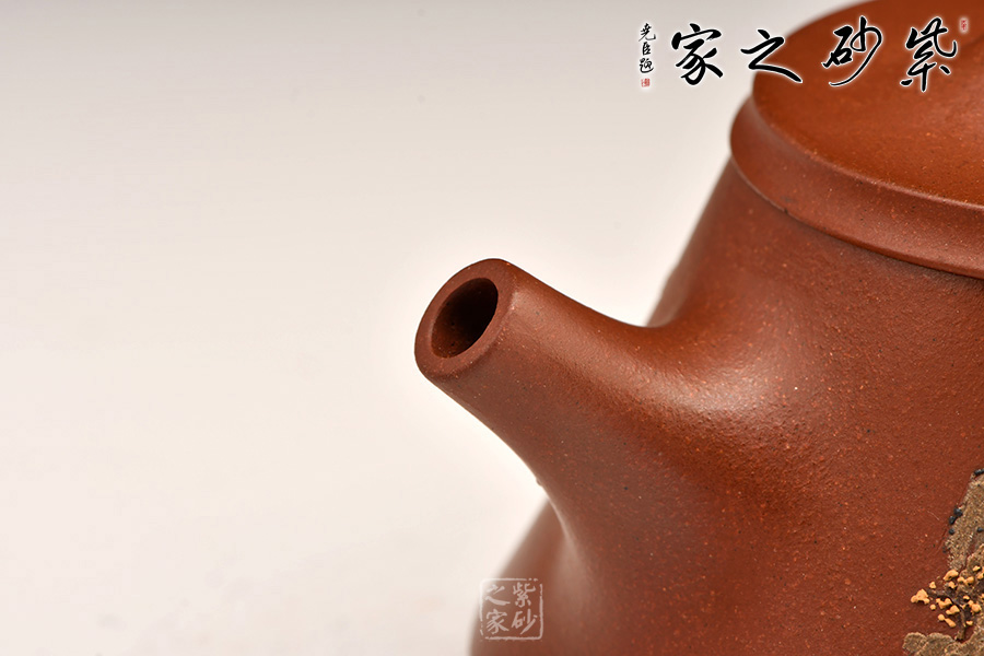 此款壺器型古拙,線面簡(jiǎn)潔明快,還不失沉穩(wěn)大度,壺身仍沿襲古老方法上小下大,使重心下垂,使用起來(lái)更穩(wěn)當(dāng)。壺嘴采用短而有力的直筒形,出水的力度更加佳,壺鈕如同一條拋物線連接壺蓋兩端,形如拱橋。