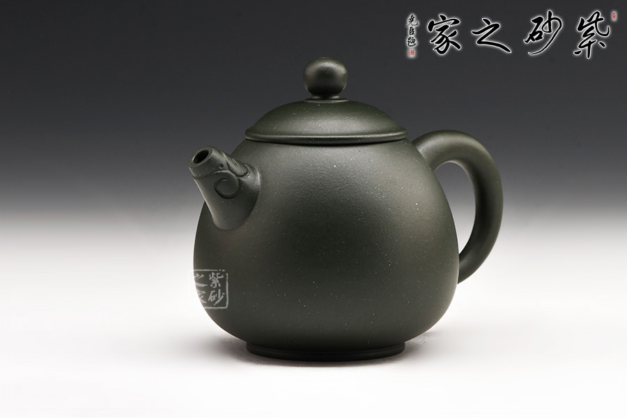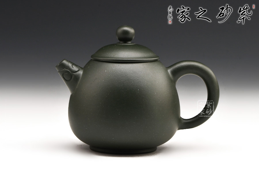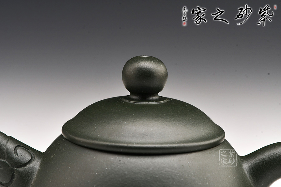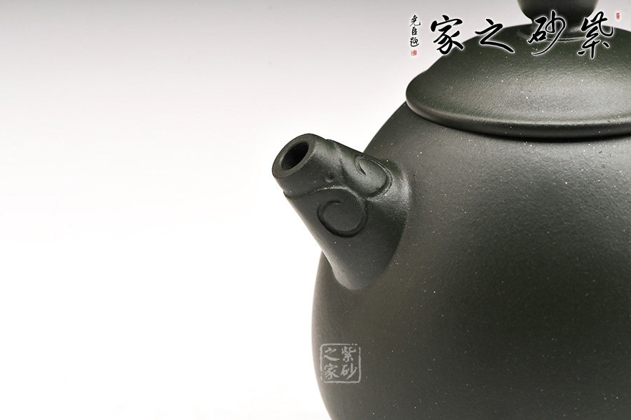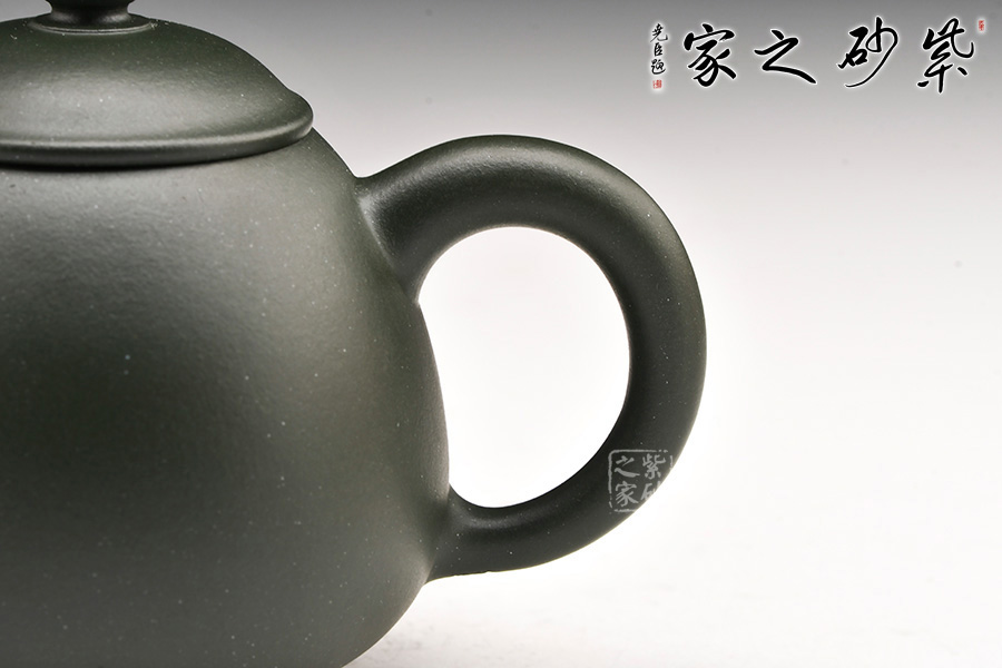 廖江玲老師所做的龍蛋壺,采用原礦墨綠泥制作。壺身直,圓潤(rùn)豐滿;短嘴直流狀,出水利落,裝飾如意紋鈕,增添美觀;壺把如耳,拿捏方便。半圓的截蓋設(shè)計(jì),壺鈕立于蓋頂,像明珠立在龍蛋上。整體看上去渾然天成,和諧統(tǒng)一。