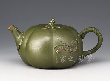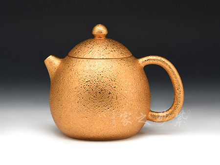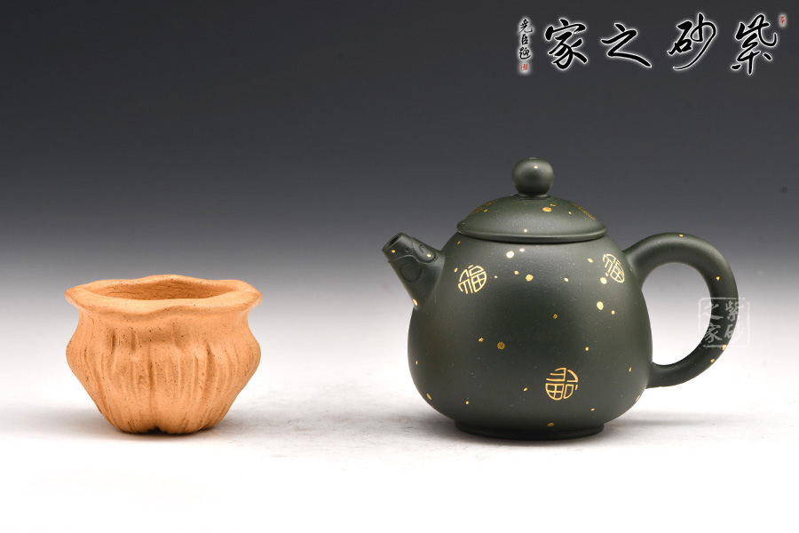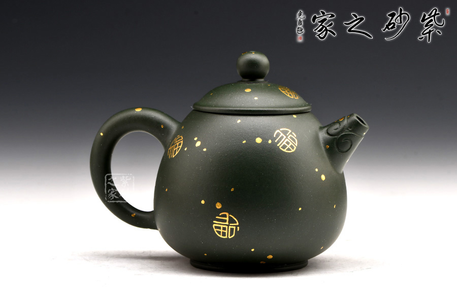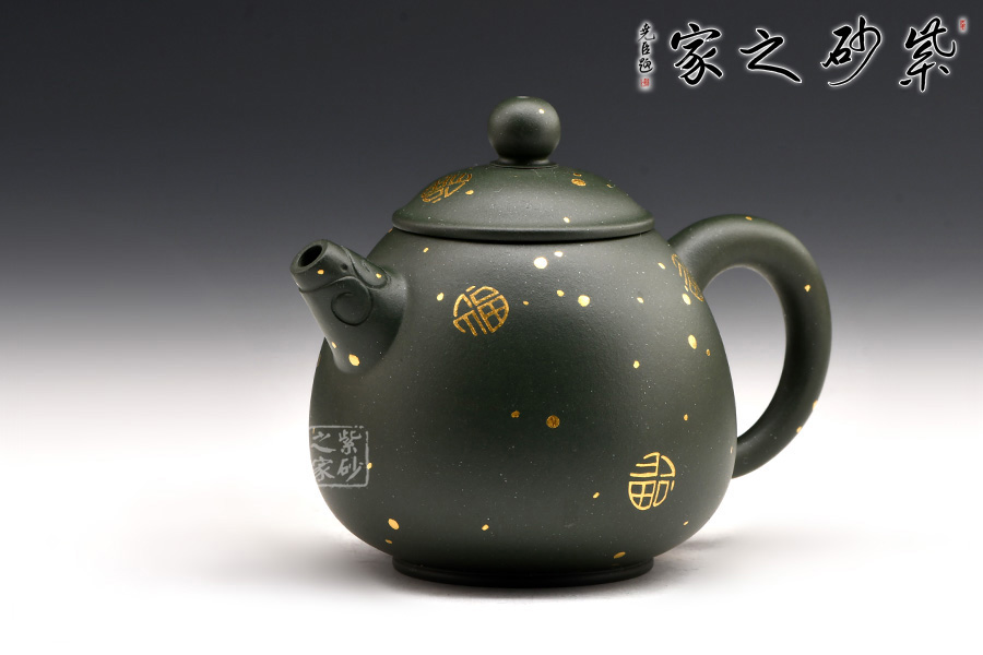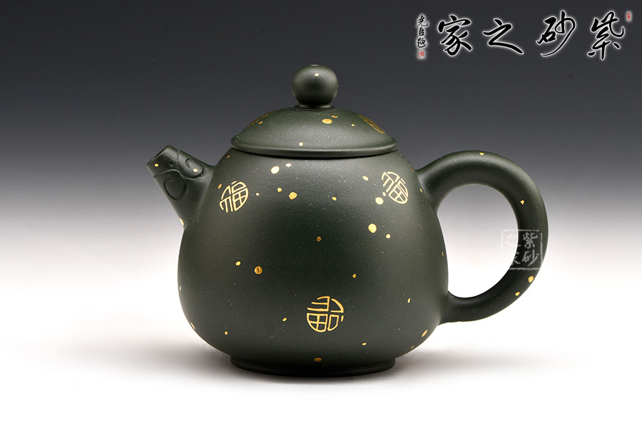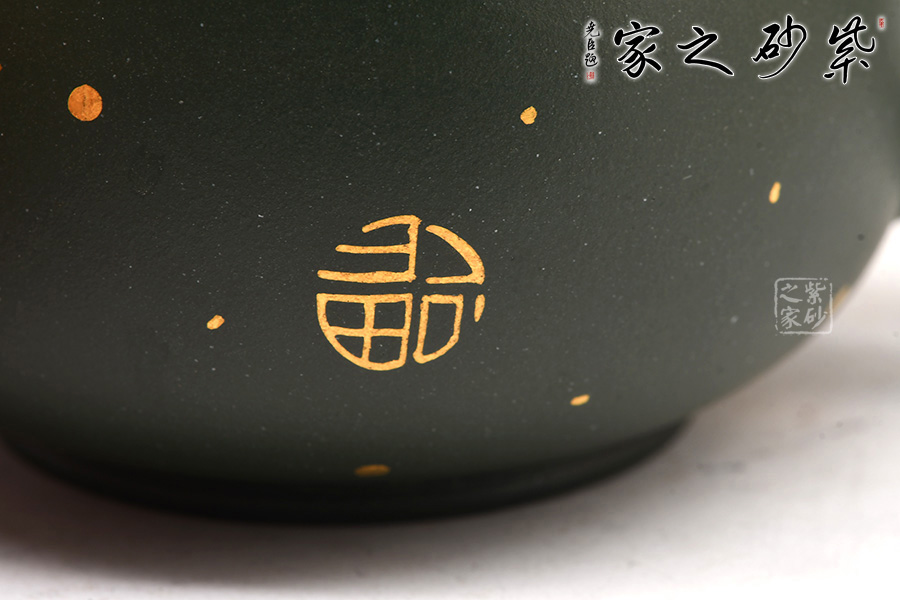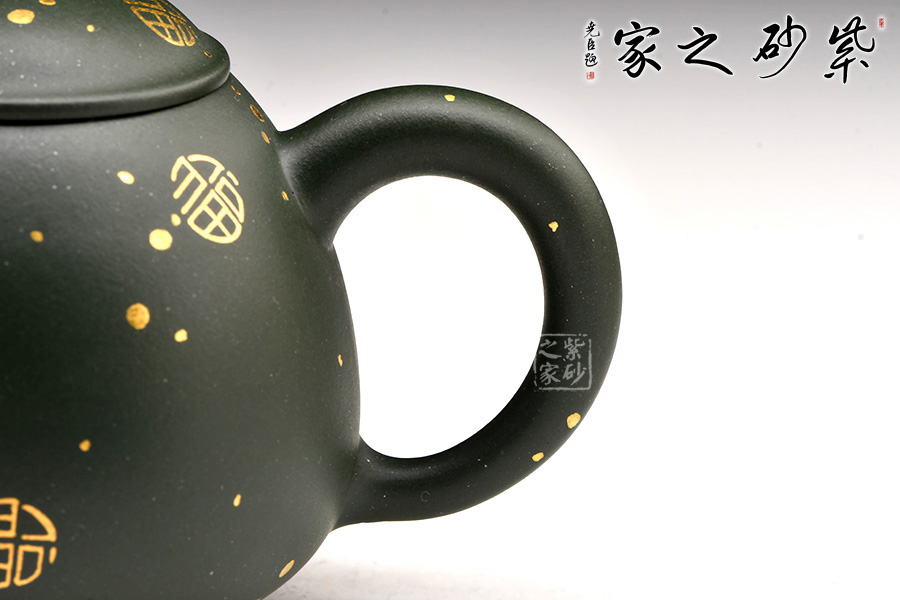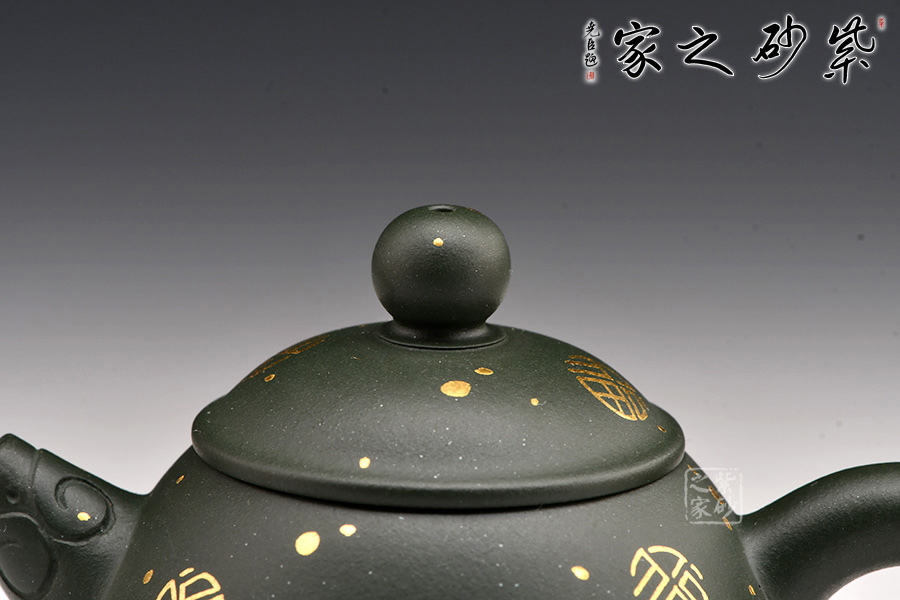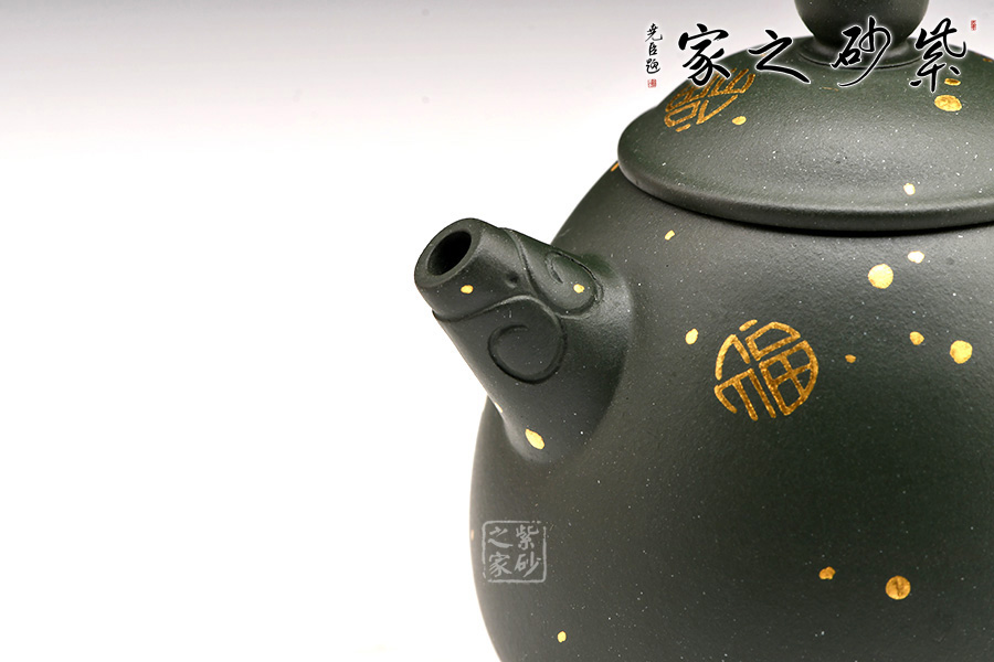 廖江玲老師所做的龍蛋壺,采用原礦墨綠泥制作。壺身直,圓潤豐滿;短嘴直流狀,出水利落,裝飾如意紋鈕,增添美觀;壺把如耳,拿捏方便。半圓的截蓋設計,壺鈕立于蓋頂,像明珠立在龍蛋上。整體看上去渾然天成,和諧統(tǒng)一。壺身描金裝飾,“?!钡?,既增添美觀,又寓意吉祥。