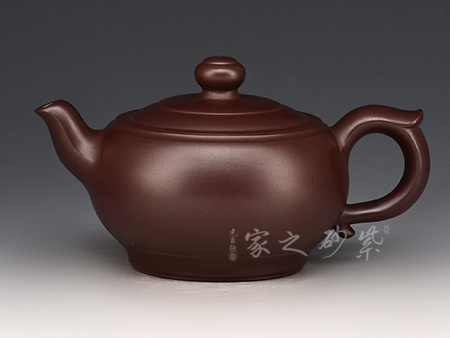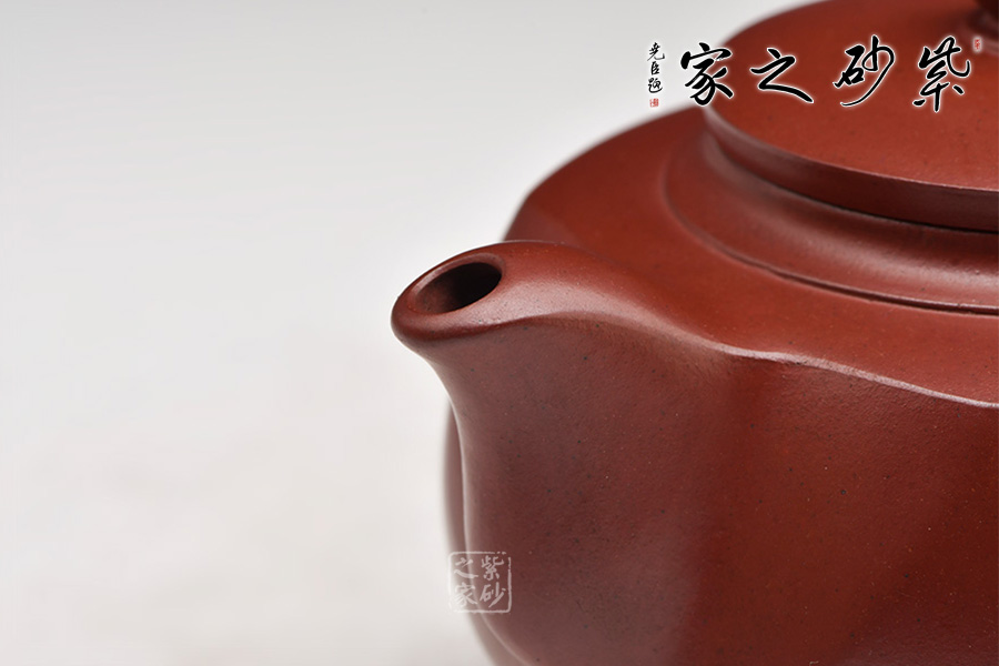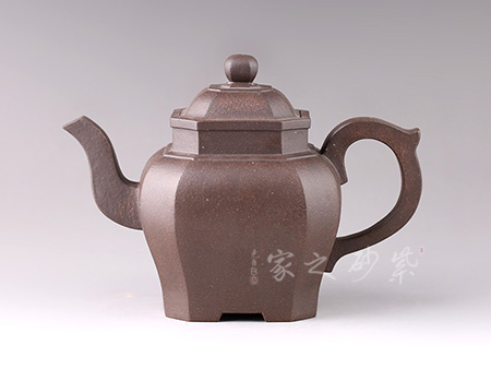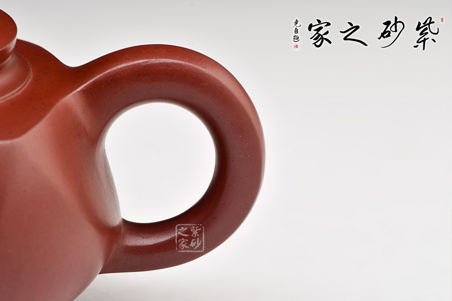 整款壺壺型古樸,壺鈕略似合斗之形,似壺身縮小版。壺蓋規(guī)整大氣,氣密性極佳,短頸方肩,壺身看似圓潤,卻圓中見方,過渡優(yōu)雅柔和。壺底棱角圓潤,觸手生溫,器型穩(wěn)重,把呈圓形,略見精巧,壺嘴壺基豐厚,嘴口圓潤,出水流暢。