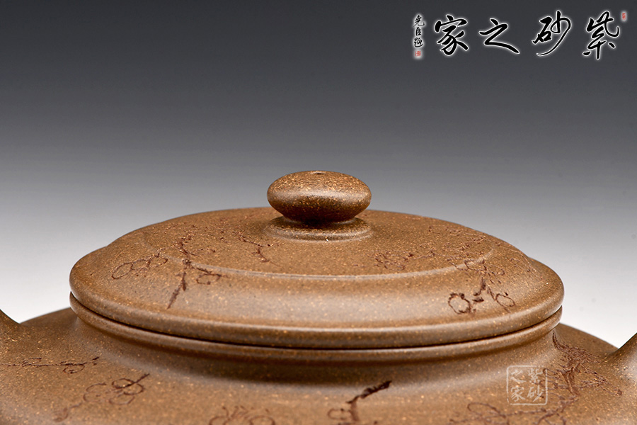 整壺壺體扁而不塌,制作難度較高。壺腹寬大,扁如玉璧,流、把舒展流暢,壺流自壺腹一彎而出,壺把自壺腹上彎至壺腹下端,與流相呼應,使得扁腹向左右延伸,有曲張之勢。壺肩平坦,蓋邊線略強于口線,正合國人天蓋地之理念。圓蓋,球形鈕,圈足底,視覺觀感上佳。