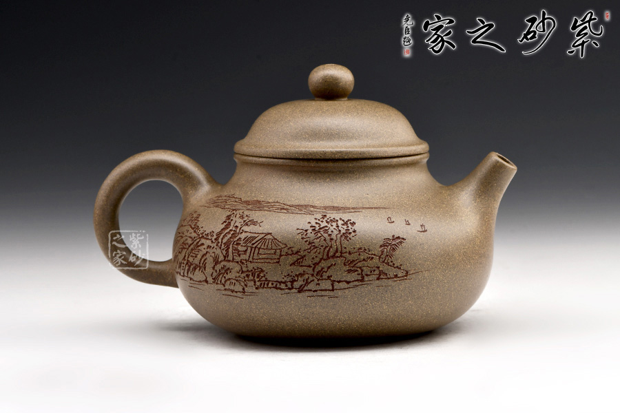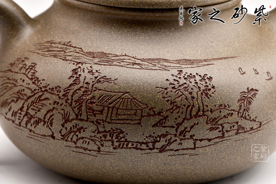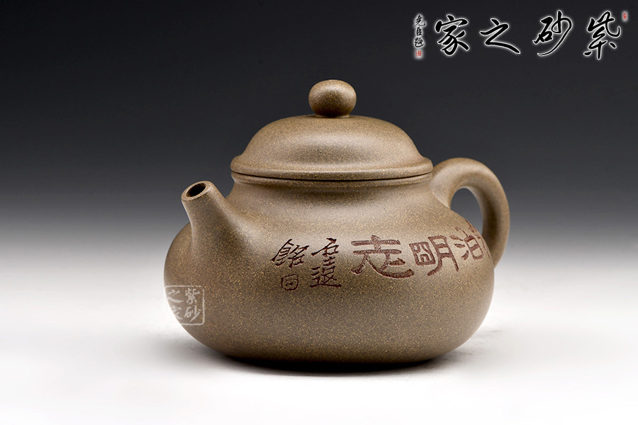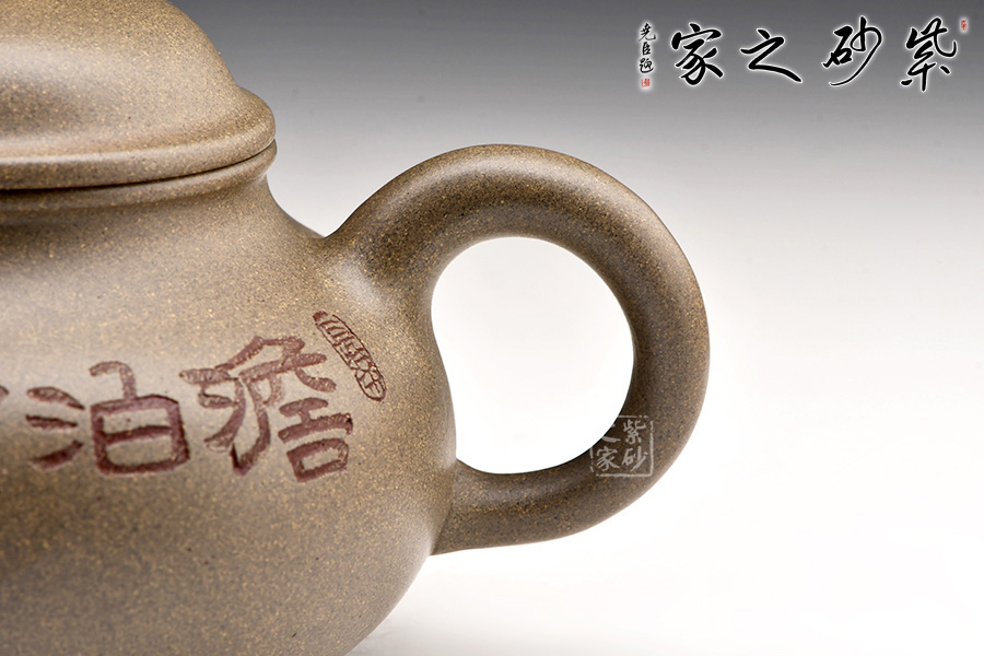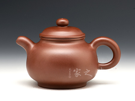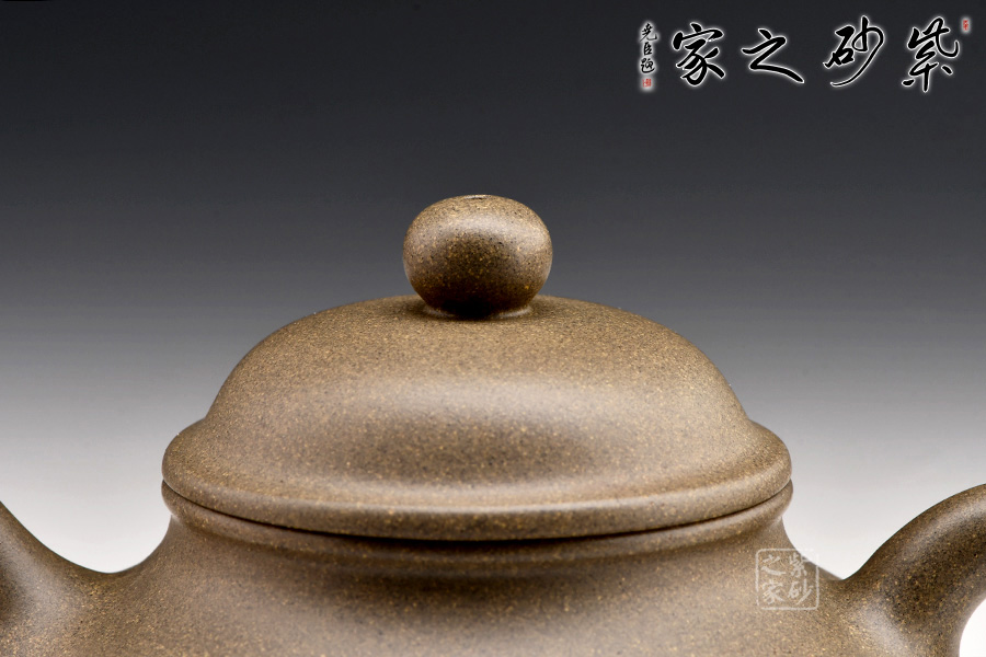 容天壺乃是紫砂經(jīng)典壺型。壺腹圓潤(rùn)而飽滿,點(diǎn)明“大肚能容”,并充分彰顯了傳統(tǒng)器型的雍容、大度、沉穩(wěn)。直流嘴出、斷水干凈,把隨圈勢(shì)。渾厚的珠鈕下一頂鼓蓋緊緊壓于壺口之上,壺口沿線流暢,與壺蓋咬合緊密。