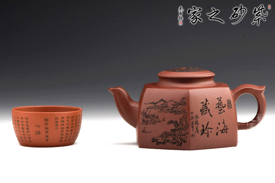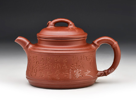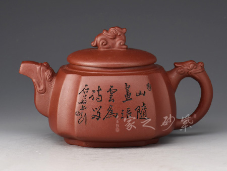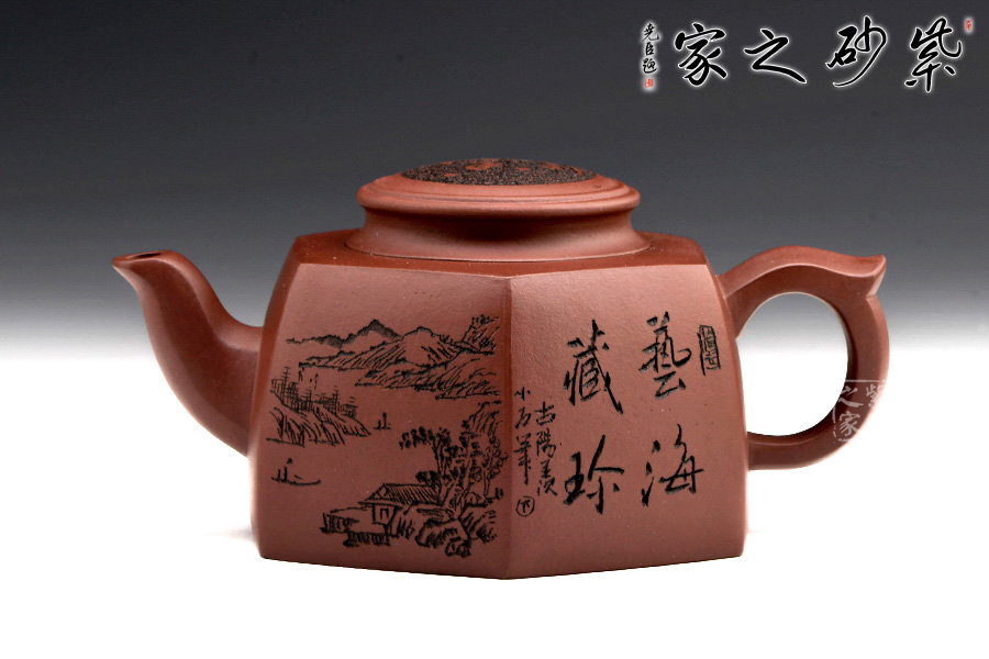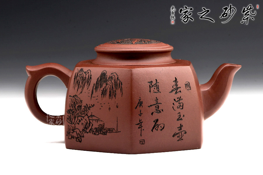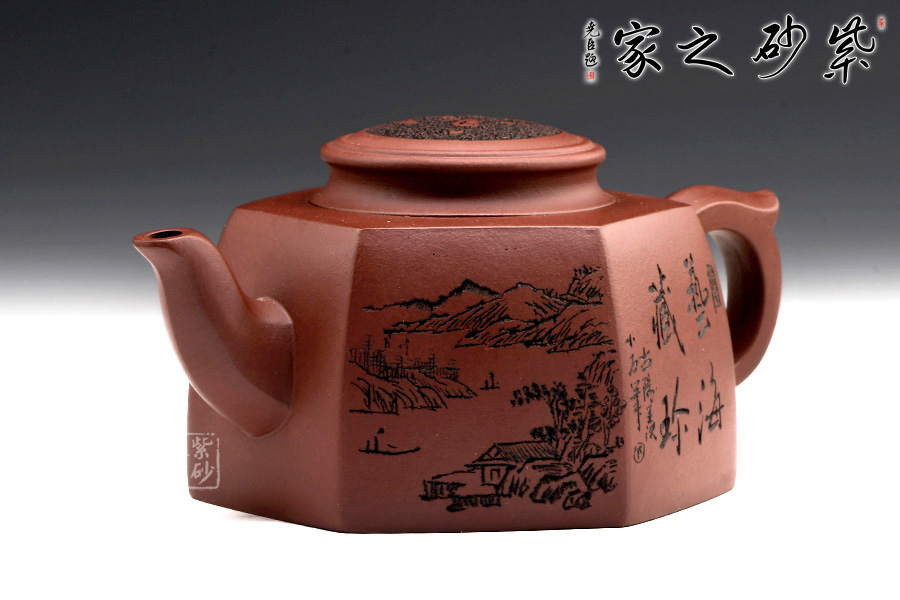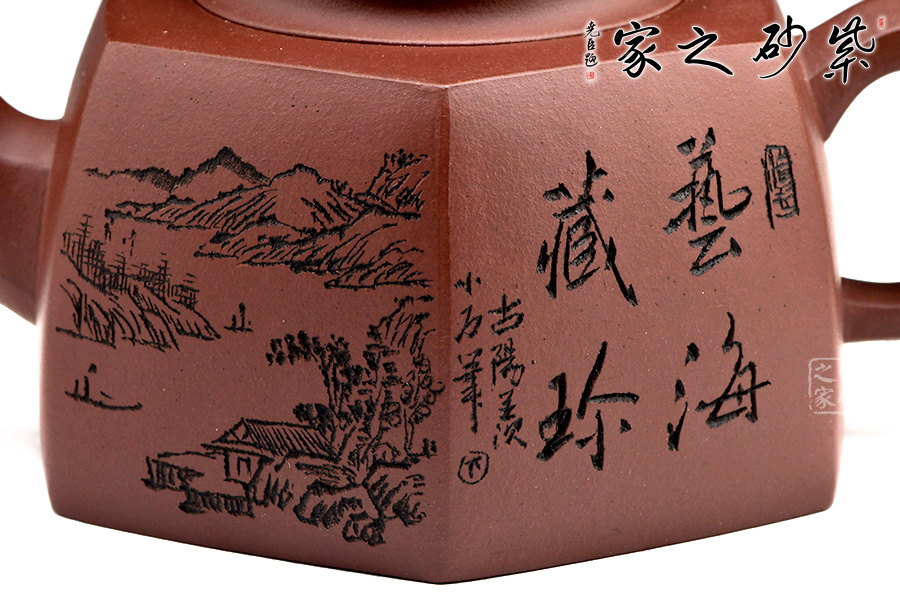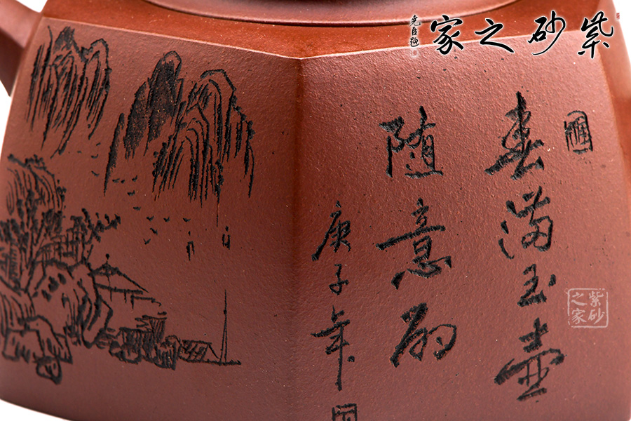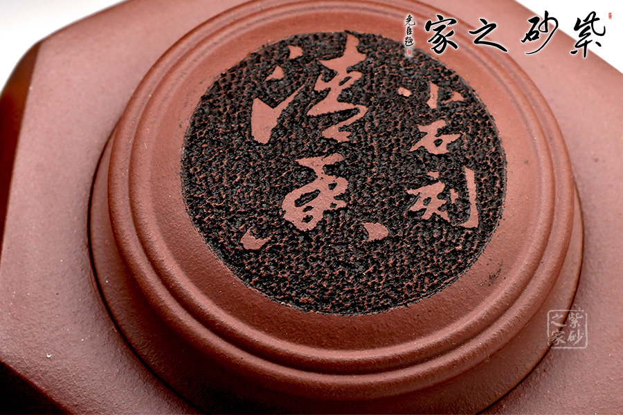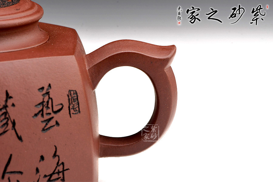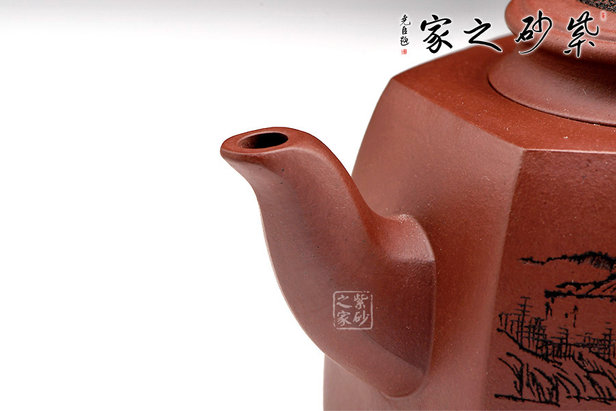 壺身上小下大,六方造型一絲不茍,工整精細(xì),足見(jiàn)制作難度和用心程度。壺肩至壺蓋部分過(guò)度平滑,蓋面線條同心環(huán)繞,層次感十足。壺嘴用六方制作,但方中有圓,不失圓滑美妙。蓋制四方,有飛貼,拿捏極為舒適。壺身刻繪飄逸瀟灑,字畫(huà)合一,有一氣呵成之暢。