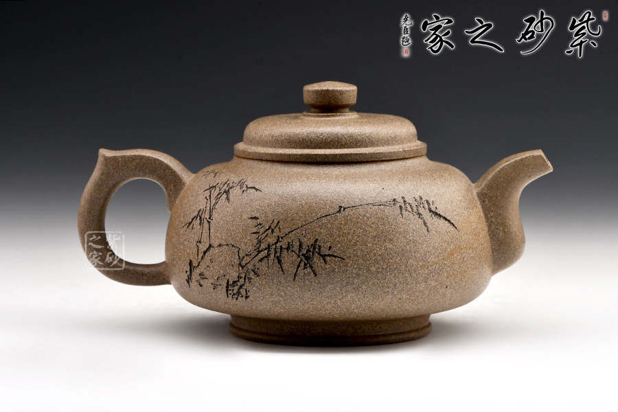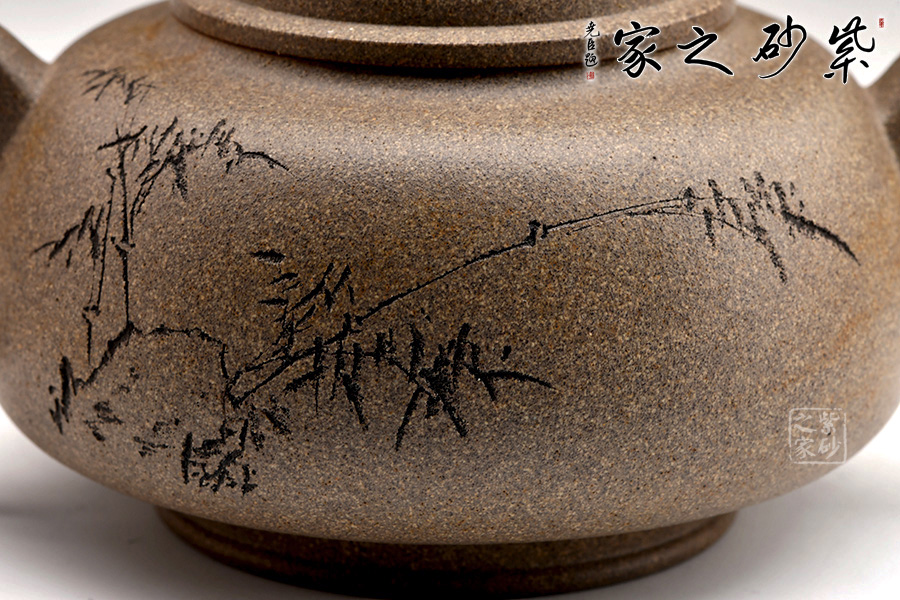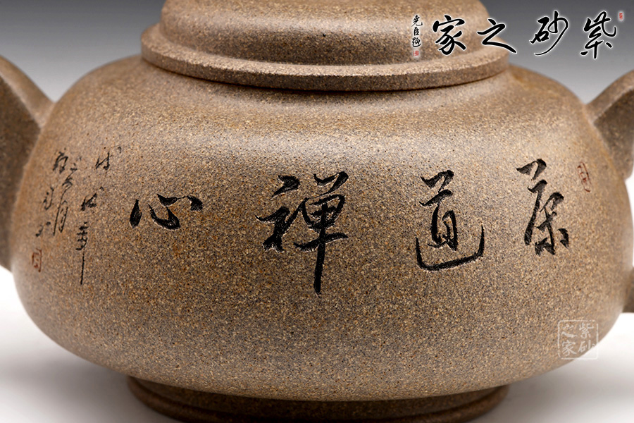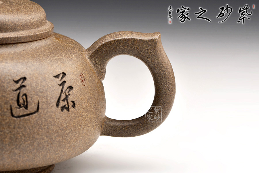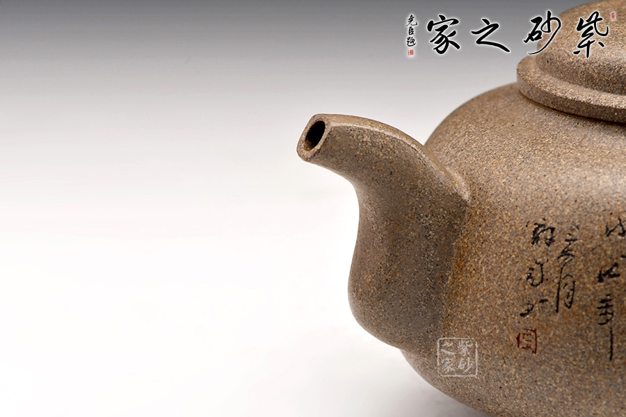 圈足底,立柱撐起壺身。壺身上斂下豐,圓潤(rùn)飽滿(mǎn)。圓壓蓋,蓋面鼓起,壺鈕圓柱形。嘴隨身勢(shì)出,方器之形,出水爽利;把彎曲有致,方圓結(jié)合,帶飛貼,端握趁手。