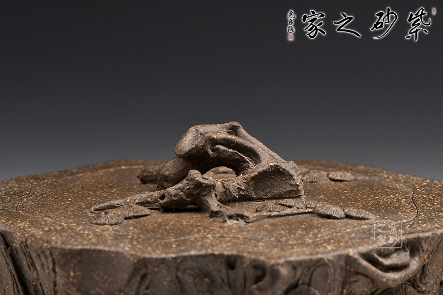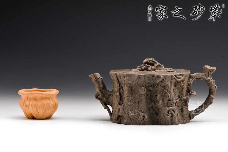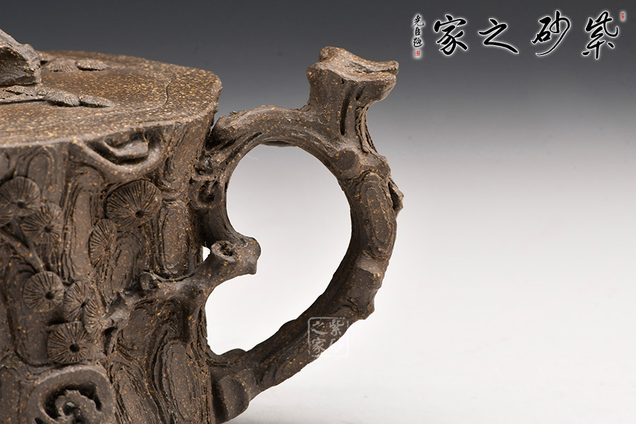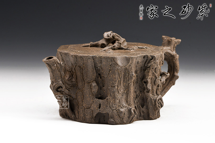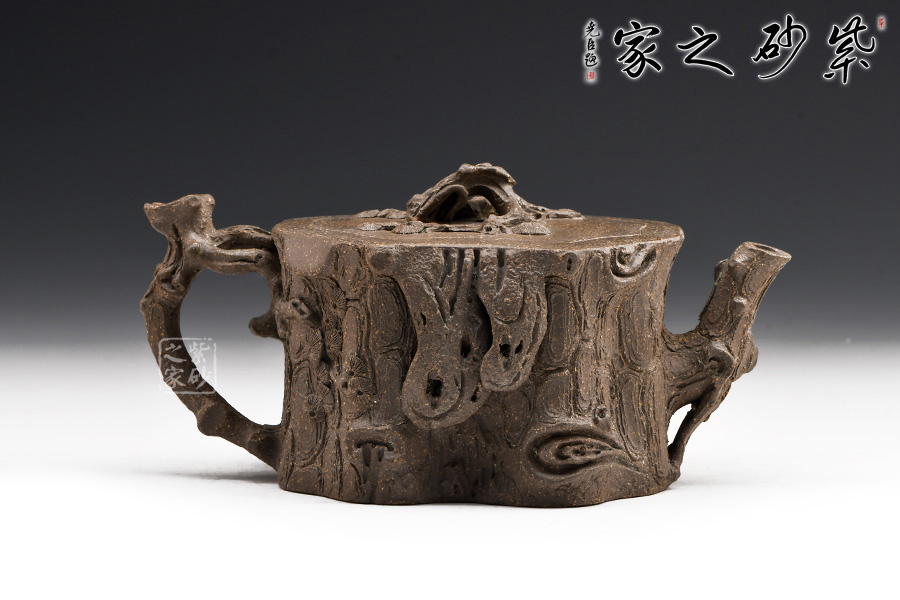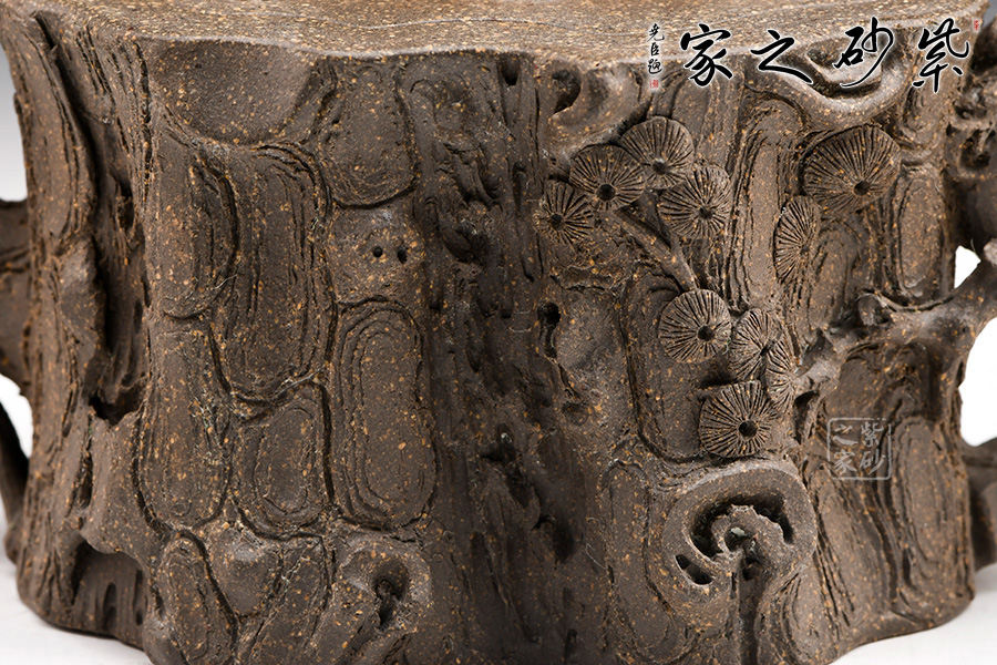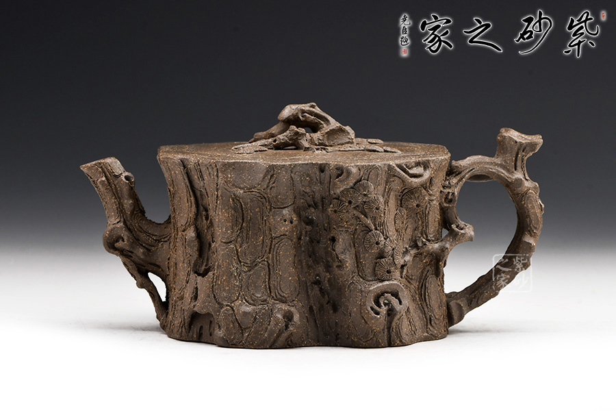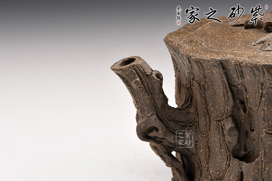 該壺造型為一截松段,通體作松樹樁形,表面斑駁嶙峋,樹皮縱橫,老味十足,逼真自如。壺流與把手以松樹枝巧塑而成,枝干、樹癭刻劃精細(xì)入微,自然生趣。蓋以松樹枝作鈕,與壺腹渾然一體。