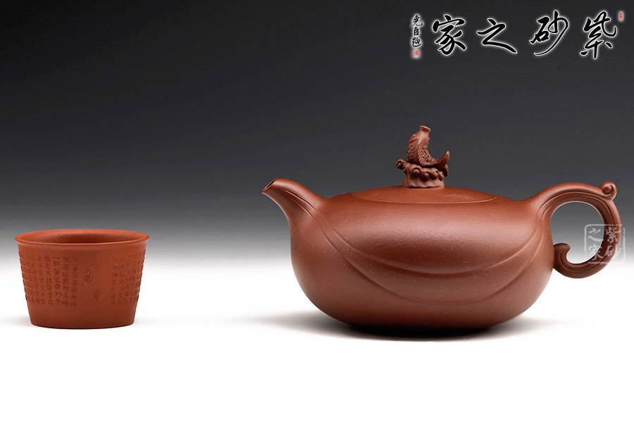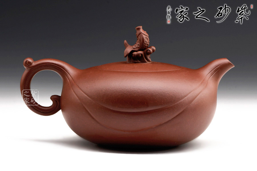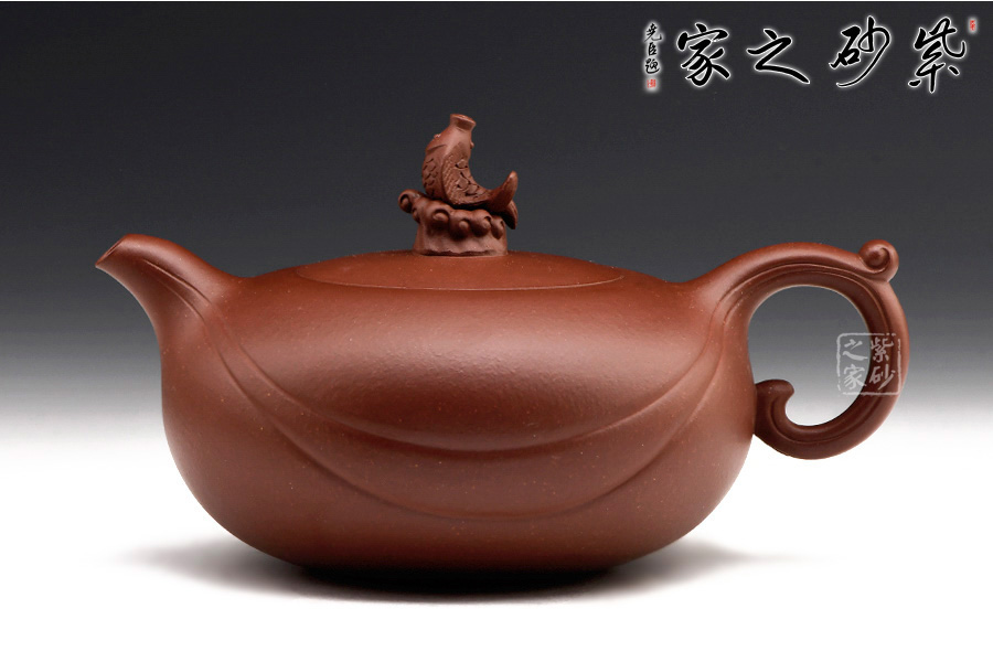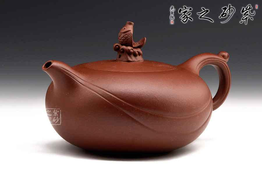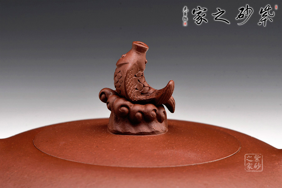 壺嘴、壺身、壺把三位一體,利落的兩條曲線,精準(zhǔn)地勾勒出海浪起伏的形態(tài)。浪花翻滾,略顯溫柔。身蓋一體,以涌起的浪花將魚托起之形做壺鈕,生動(dòng)形象,逼真自如。