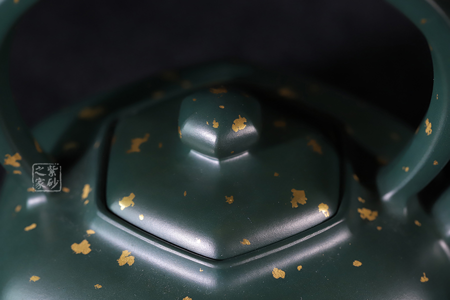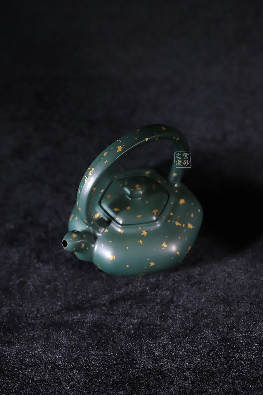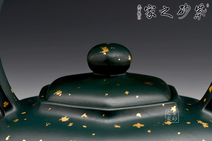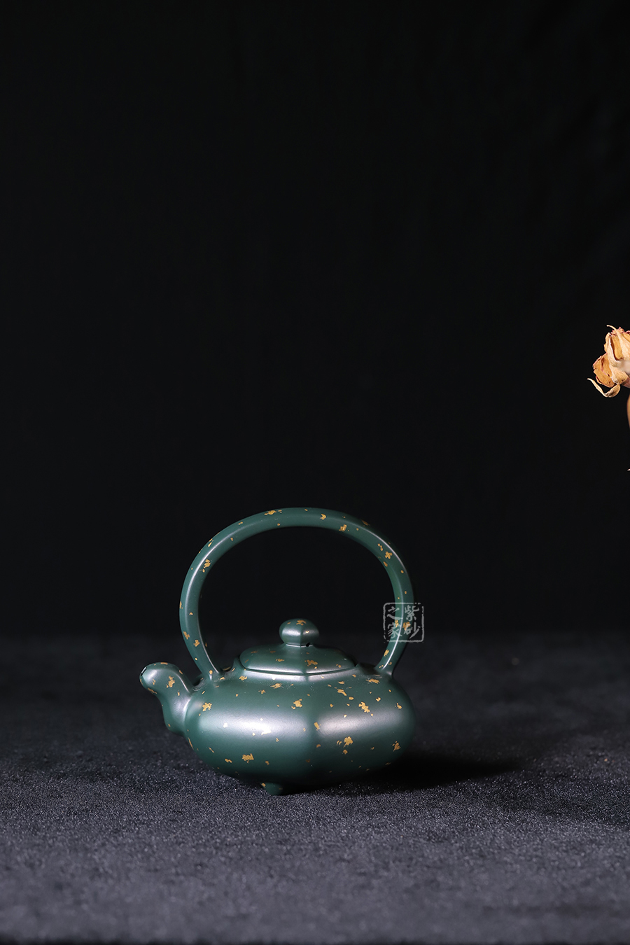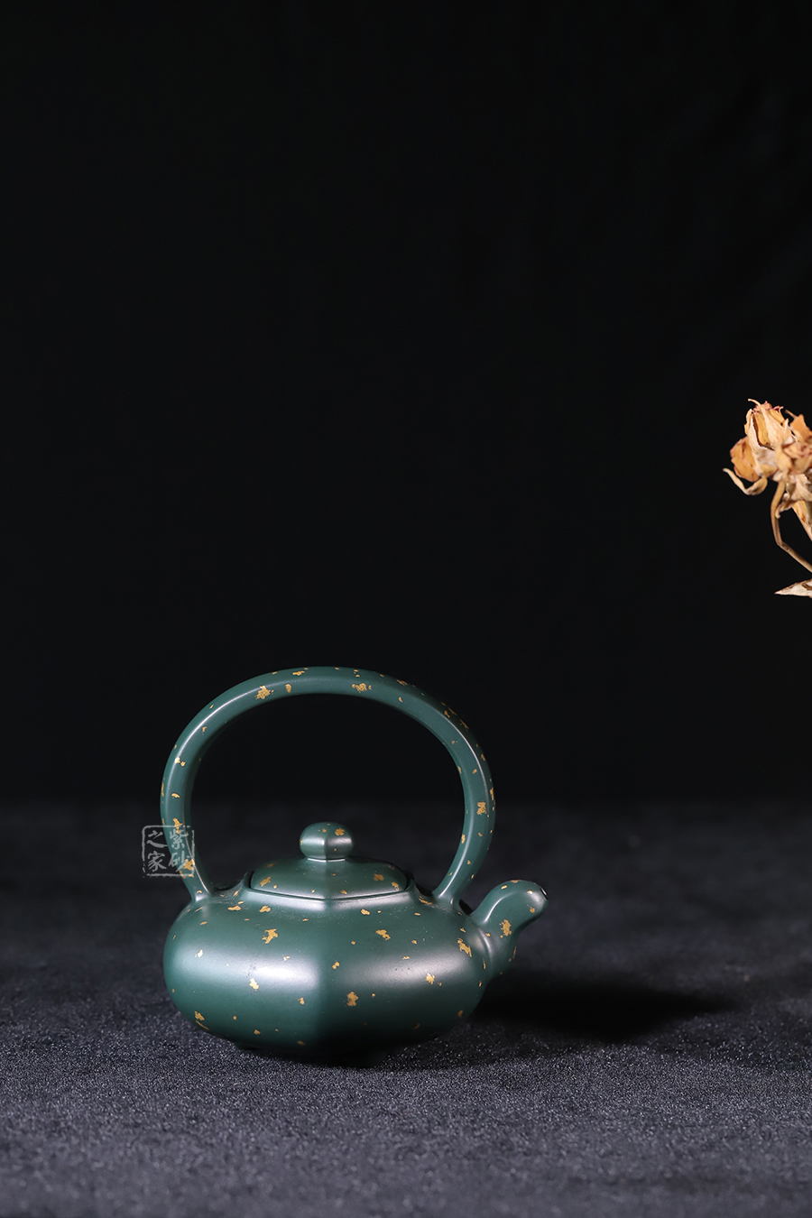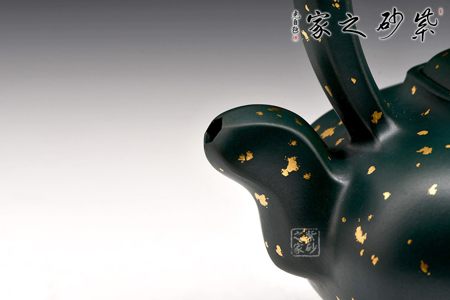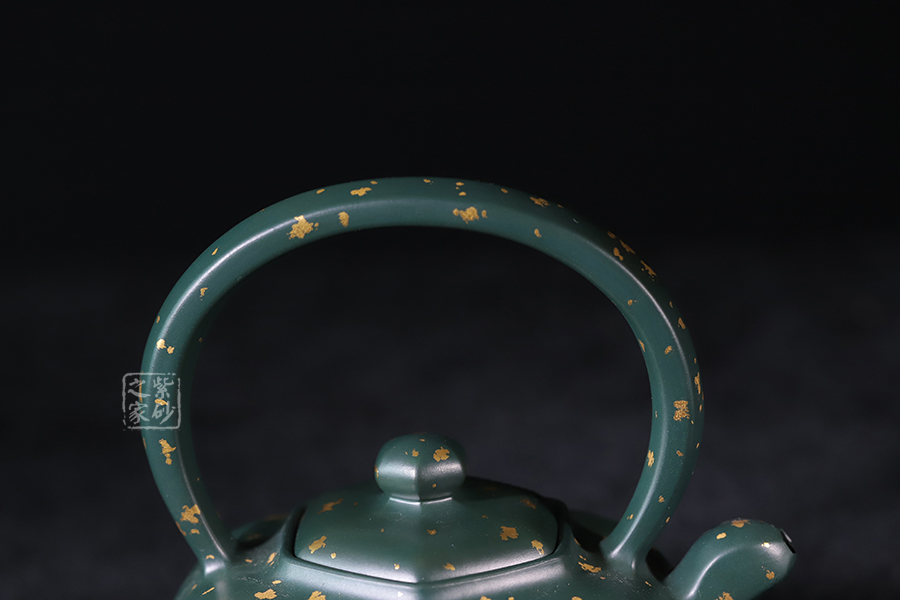 原礦墨綠泥制作,點金工藝裝飾。底部三乳足,六方造型塊面簡潔,分割一致。嵌入六方蓋,頂部寶珠紐。圓潤夸張的提梁擎起一道劃破蒼穹的弧線,巧妙地為“圣珠”壺紐創(chuàng)造出光圈效果。