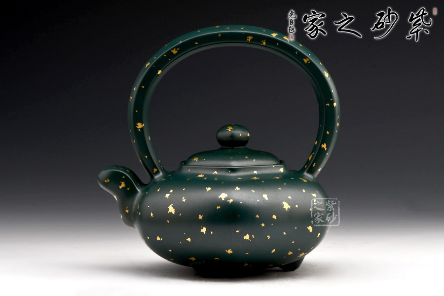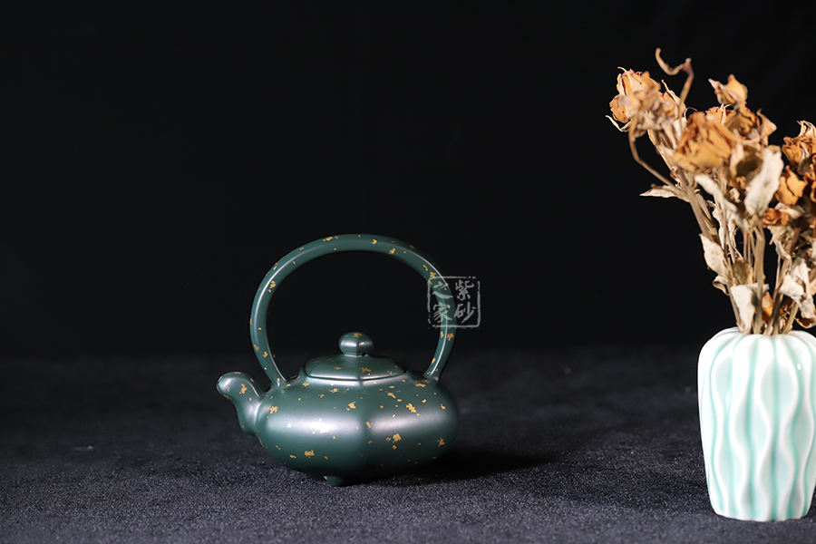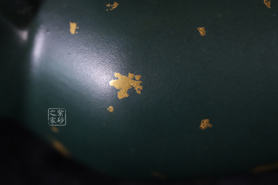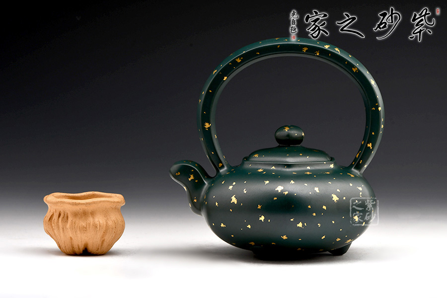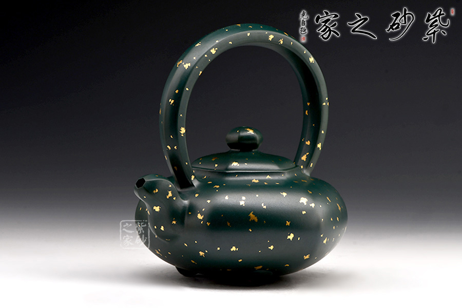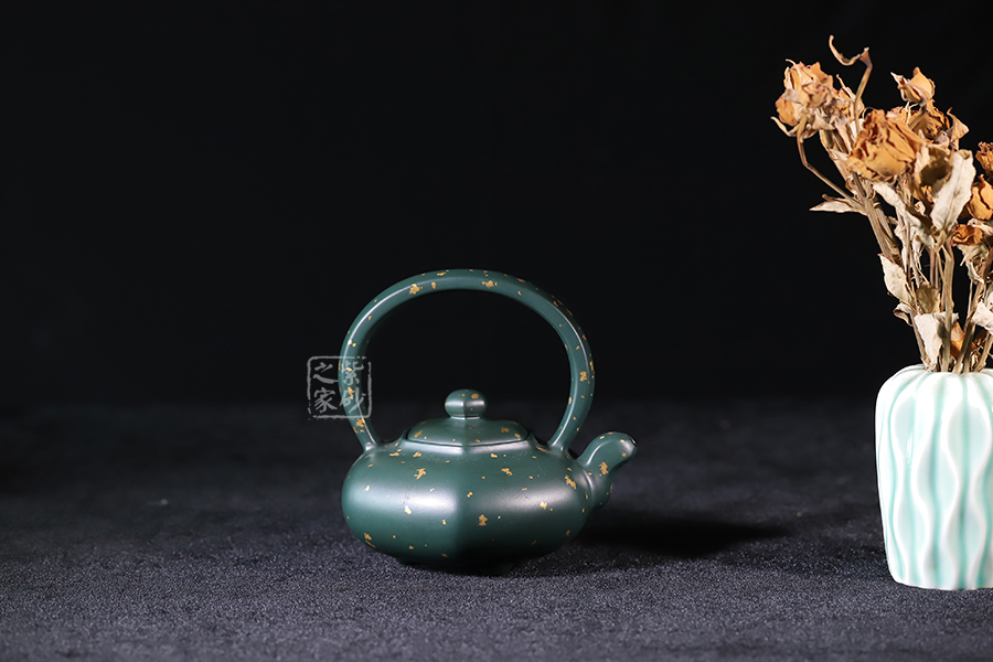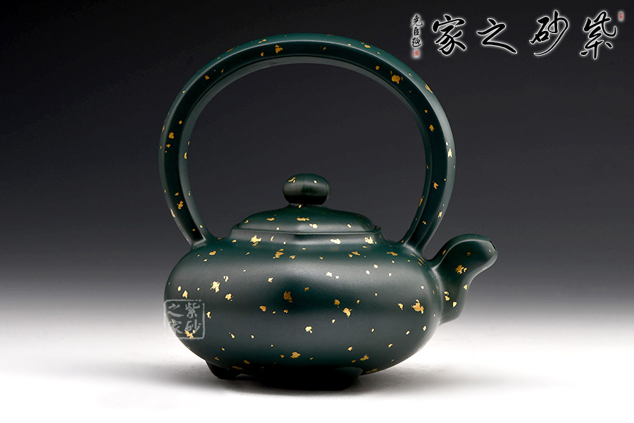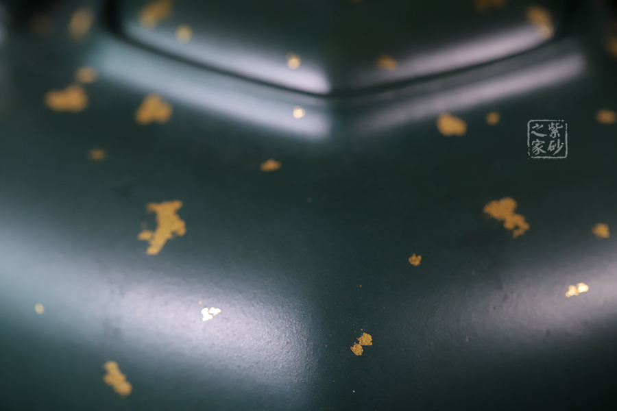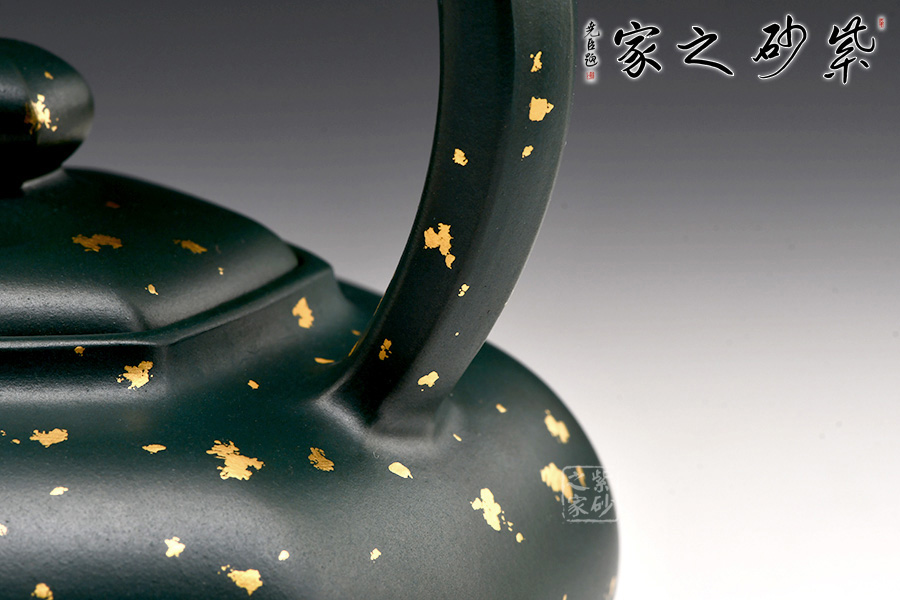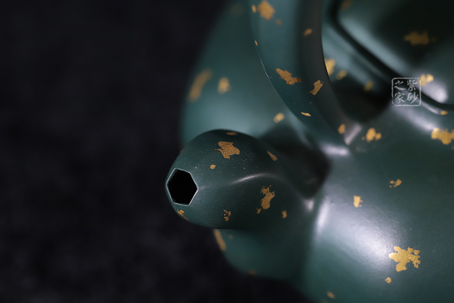 原礦墨綠泥制作,點金工藝裝飾。底部三乳足,六方造型塊面簡潔,分割一致。嵌入六方蓋,頂部寶珠紐。圓潤夸張的提梁擎起一道劃破蒼穹的弧線,巧妙地為“圣珠”壺紐創(chuàng)造出光圈效果。
