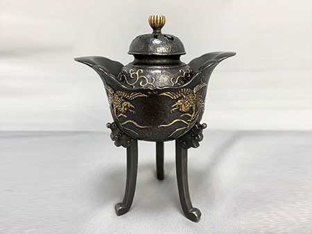 在江戶時代,金壽堂還是以制作鍋、釜為主,到了明治時代以后,開始制作銅器(高岡銅器)及鐵瓶。因其品質(zhì)優(yōu)良,在業(yè)界之中獲得了很高的聲望。后來由于戰(zhàn)爭的關(guān)系,鑄造被迫中斷。到了60年之后的平成時代,市場上對于銅器等金屬器物的需求愈發(fā)膨脹,高岡地區(qū)的職人工匠為了紀(jì)念曾經(jīng)的“金壽堂”,重新以“金壽堂”之名,專注于制作優(yōu)良銅器、銀器以及鐵瓶。又因“高陵”是高岡的別名,于是將堂號取名為“高陵金壽堂”。