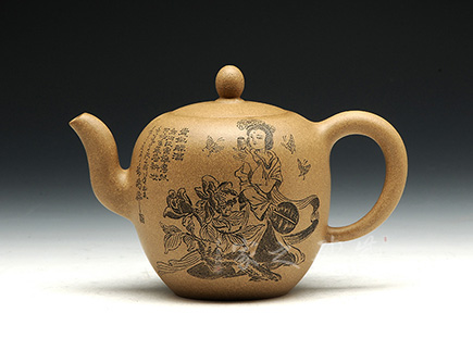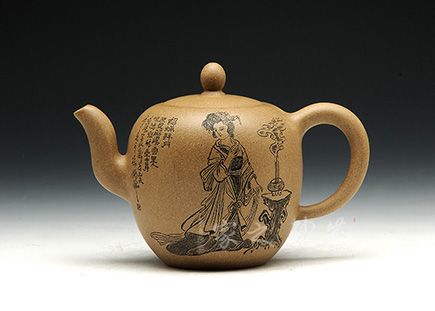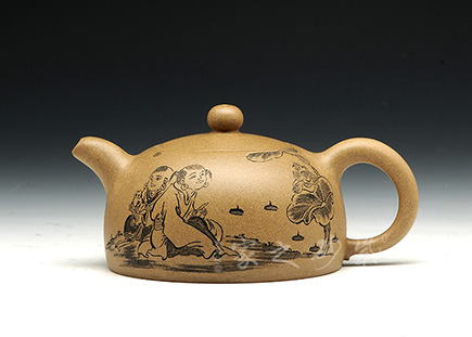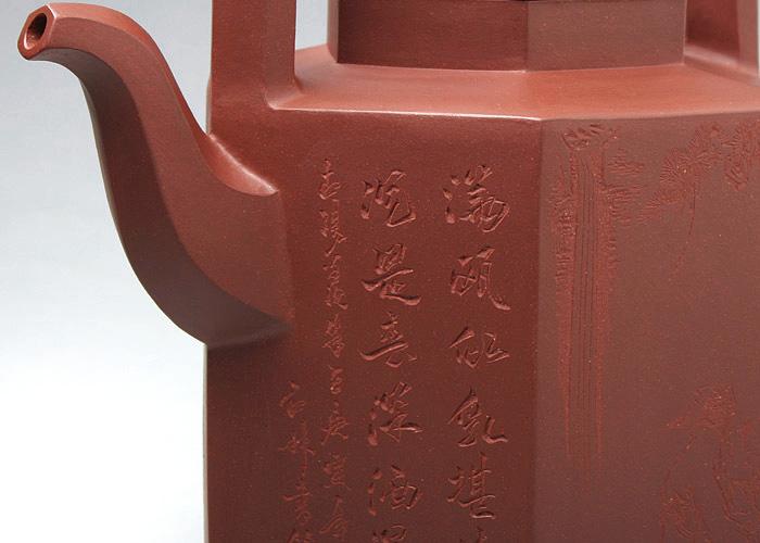 此款提梁在造型上似有方方正正之感,卻能讓線條更加俊朗有力,增加壺體的力量之美,所謂大器方成便是如此。壺身刻有六句不同的銘文,以及不同的山水繪畫,無疑給剛勁有力的壺體增添了一份活力,銘文與刻繪給人鏗鏘有力之感,有如一錚錚換骨硬漢形象,而流線形的壺嘴與壺身的完美結(jié)合,亦是作者工藝的高超之處,流線形的壺嘴使得出水不斷流,值得注意的是壺把,與傳統(tǒng)的精小壺把相比,如此高度的壺把更有大氣之范。