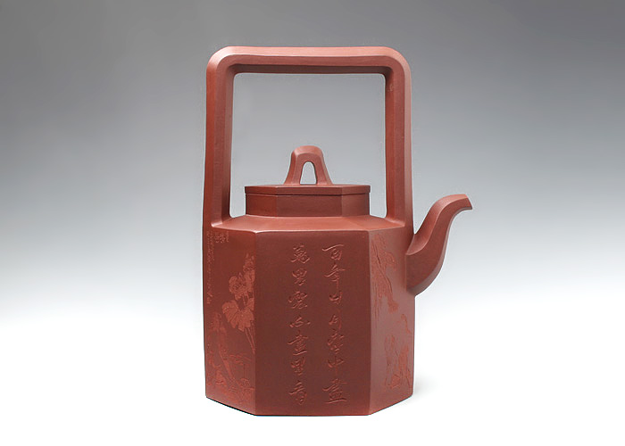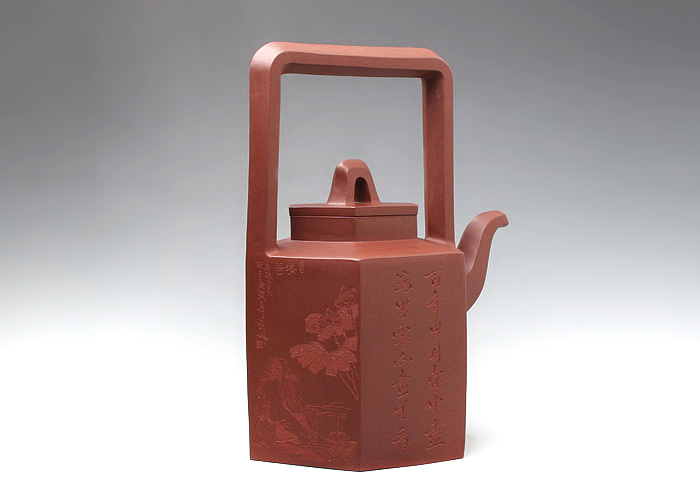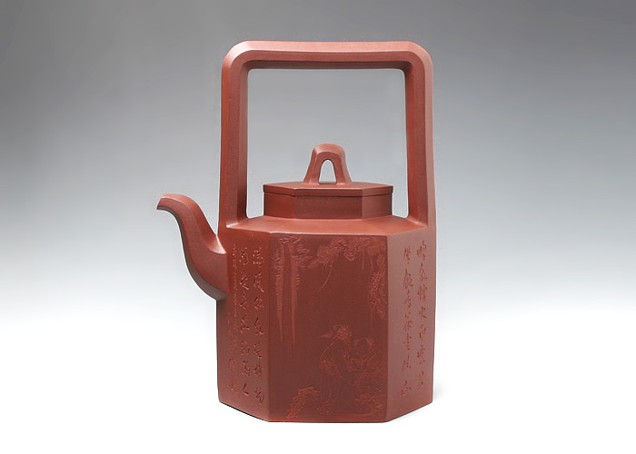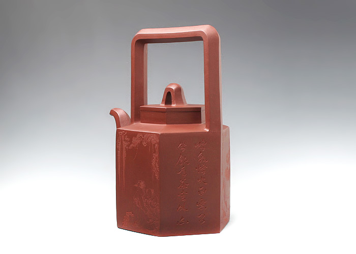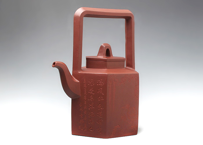 提梁壺是歷代紫砂大師所中意的主題之一,六方提梁因壺似六方柱形而得名,六方曲流使壺體更端莊大器。