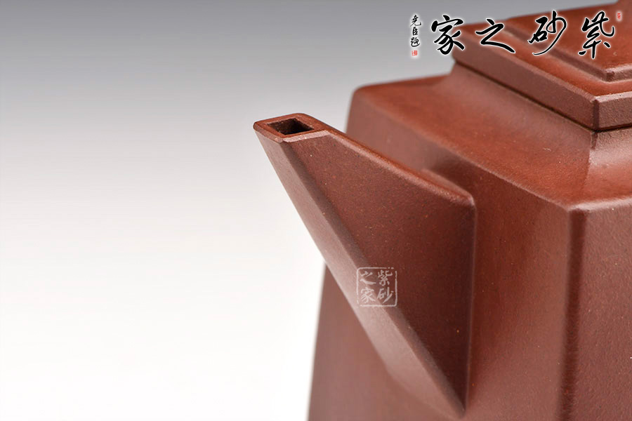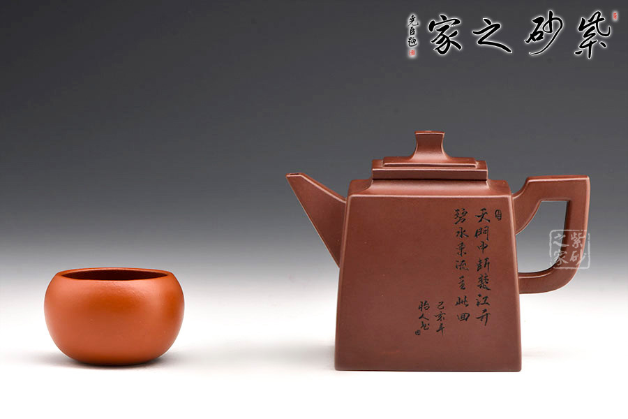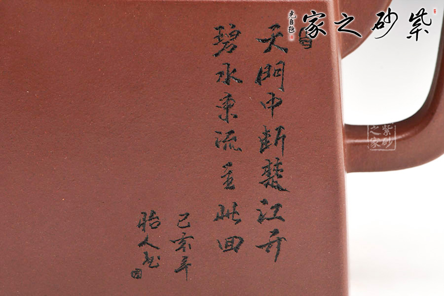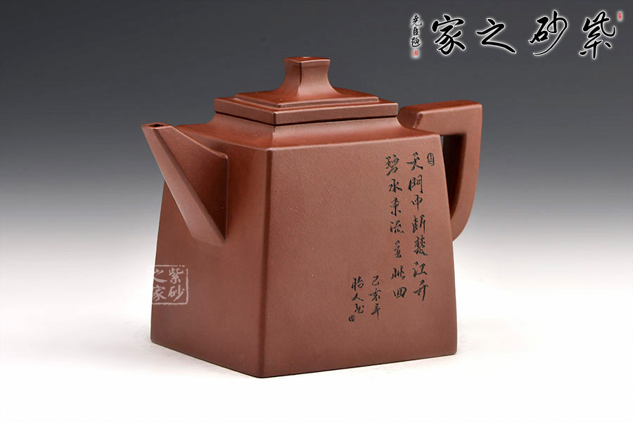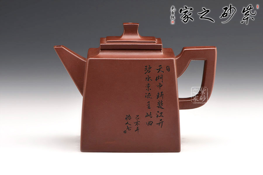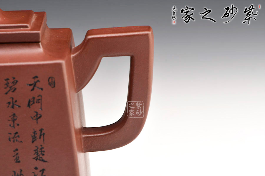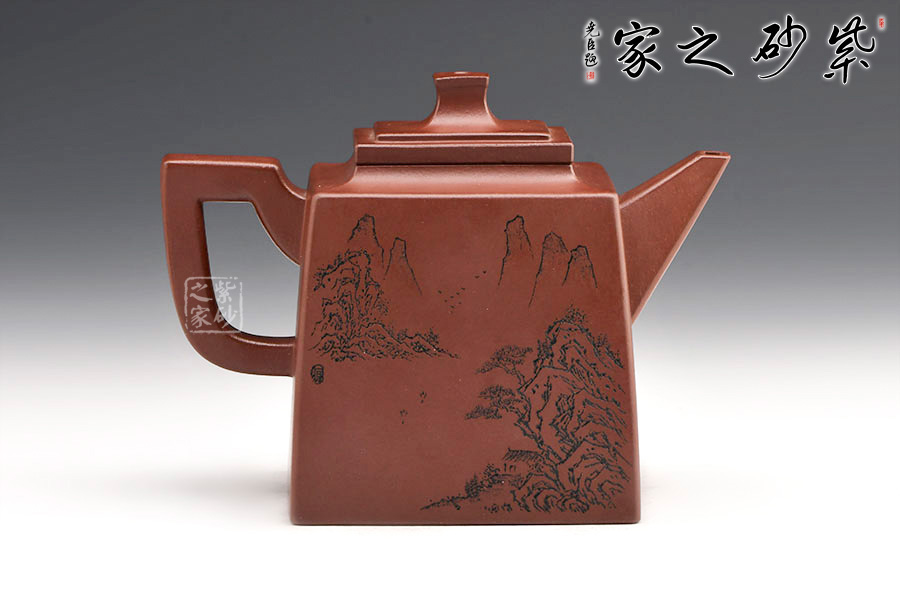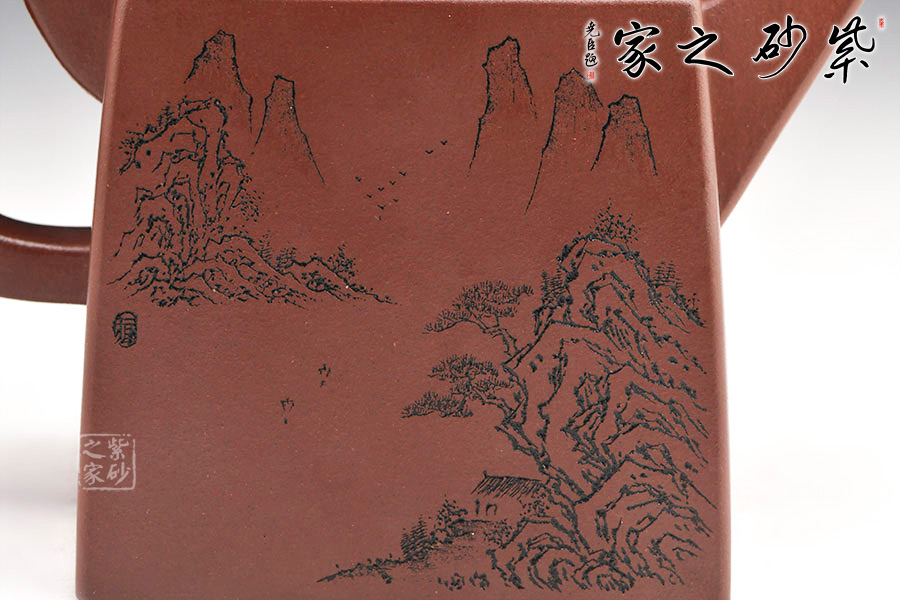 玲瓏四方壺四方壺體,端莊大氣。劍流嘴,流基寬大,出水流暢。方蓋與壺身完美結(jié)合,做工精細,對稱和諧,莊嚴肅穆,威震八方。一面刻字,一面刻繪山居圖,遠處為山,近處有水,清朗怡人。