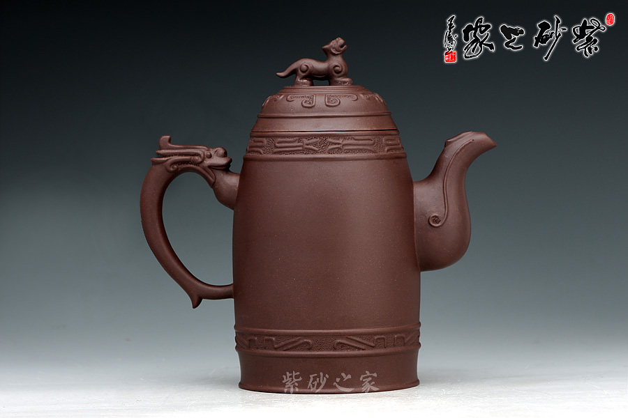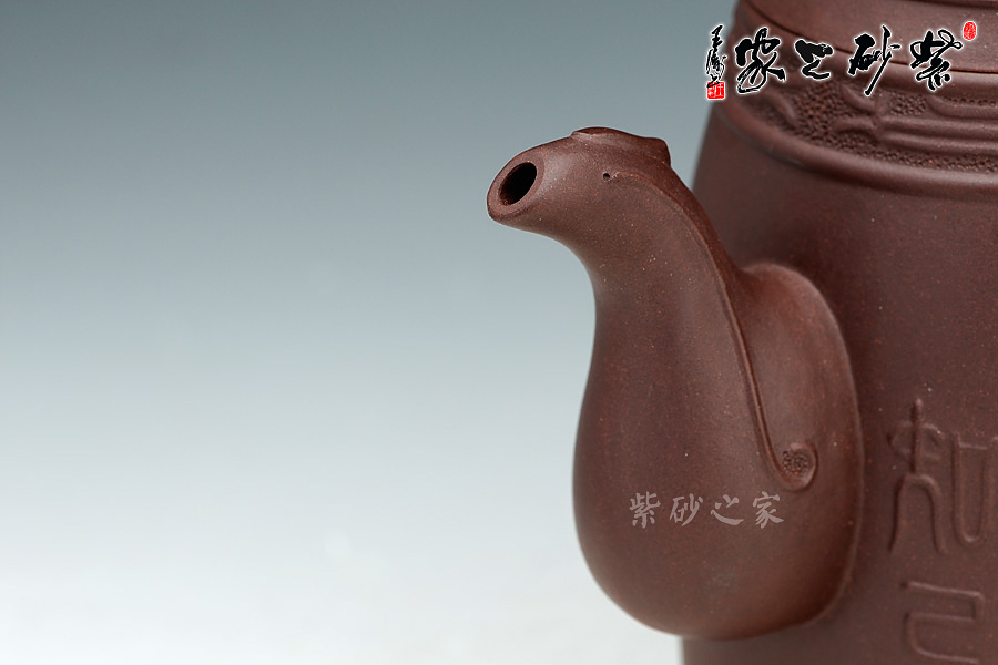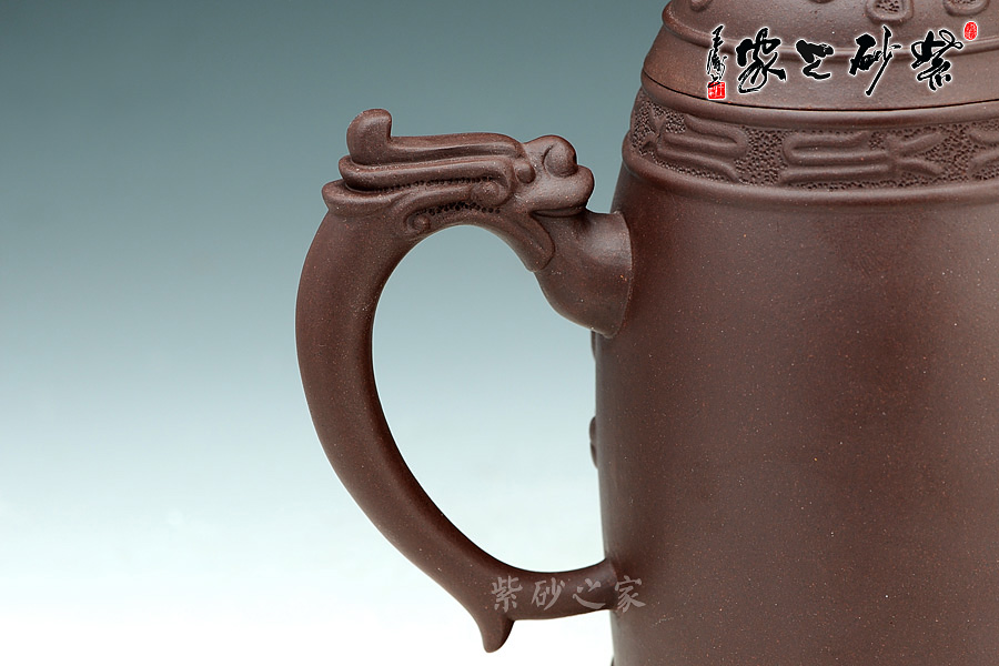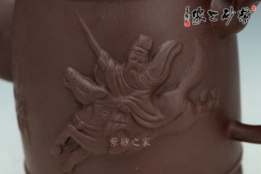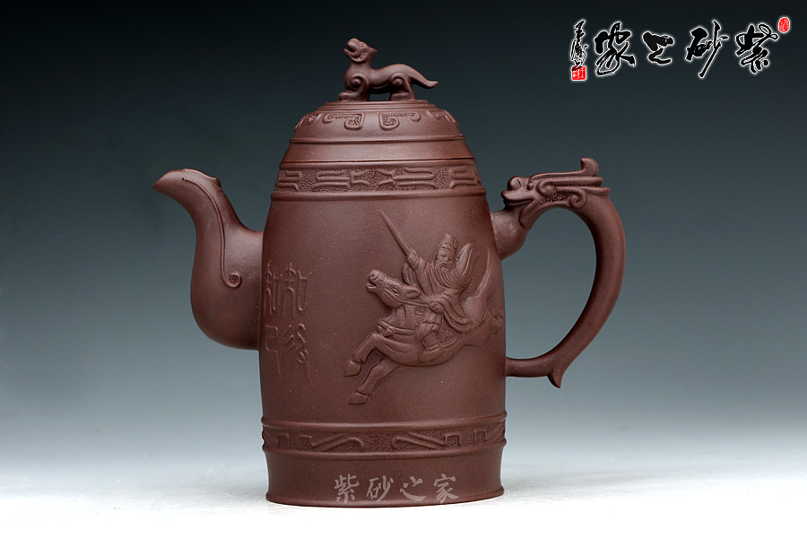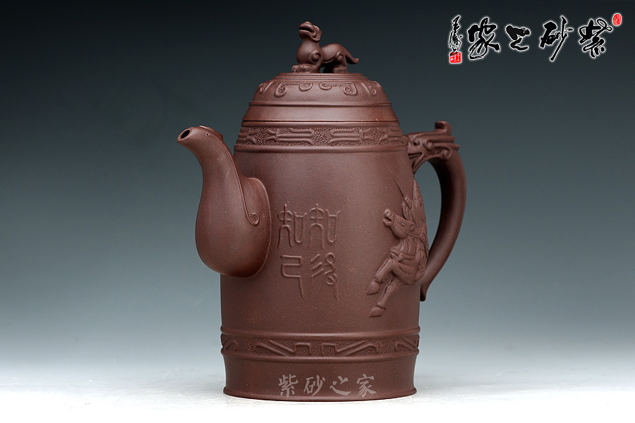 此款壺筒身較高似為圓柱形,因由底槽清泥制作而成,用手觸摸沙質(zhì)細(xì)膩,且色澤穩(wěn)重,與將軍大氣之風(fēng)吻合,壺身刻有馳騁沙場的將軍形象,作者將錚錚鐵骨形象刻繪得淋漓盡致,將軍誓死為國的氣概全在作者的手下展現(xiàn),刻會(huì)的象形文字字體柔韻優(yōu)美,飄逸撒脫,充滿了意韻之美,可見作者的刻繪功底;以龍的形象作為壺把又多了一份王者之風(fēng),又以鳳的頭作為壺嘴增加貴族氣息,龍與鳳的完美結(jié)合乃天下美談。