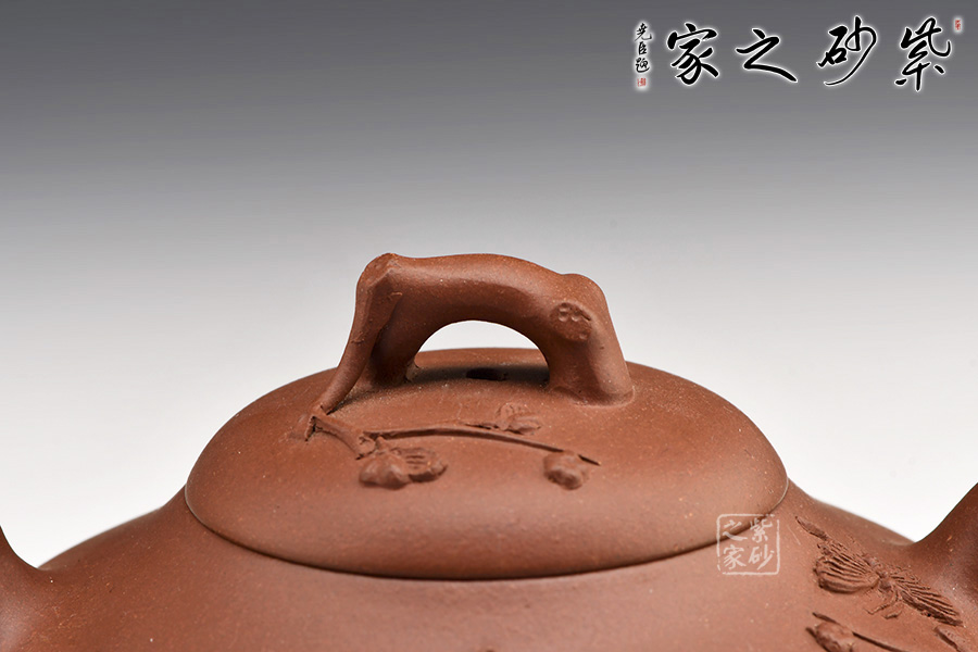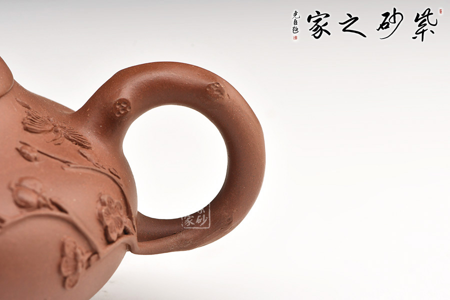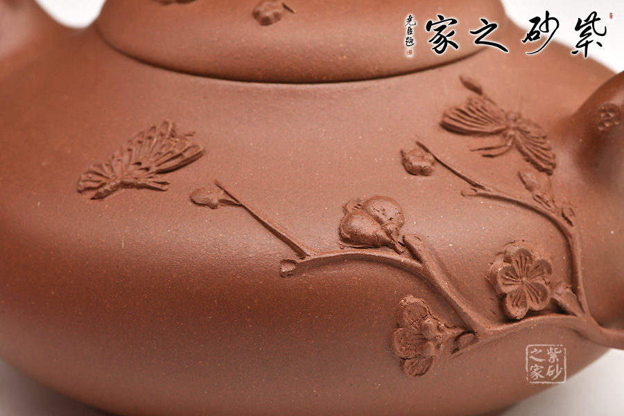 壺嘴、壺把和壺鈕都非常傳統(tǒng),彎流小巧,環(huán)形順暢,橋鈕有致,樹枝形態(tài)貼近自然,生動美觀。身蓋上泥塑枝丫花朵,清晰可辨,花朵艷麗,引來蝴蝶飛舞。