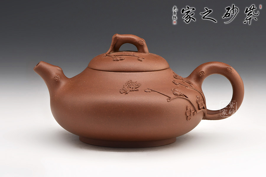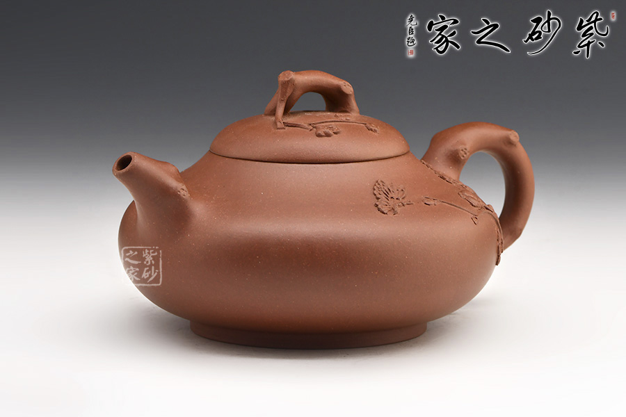 黃昱老師創(chuàng)作的蝶戀花紫砂壺,圈底,壺身圓潤,壺腹飽滿,半圓截蓋。