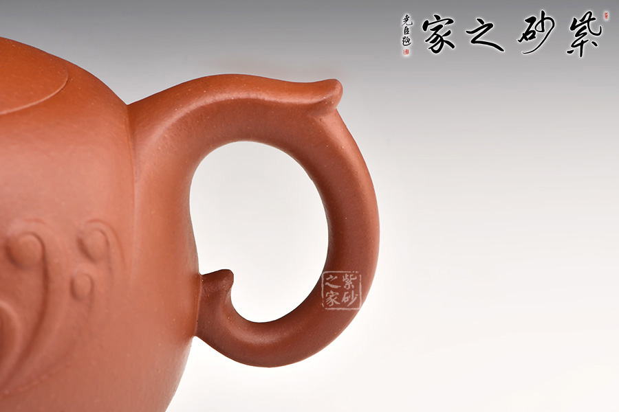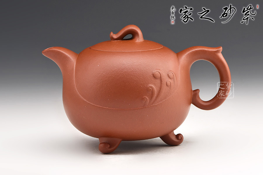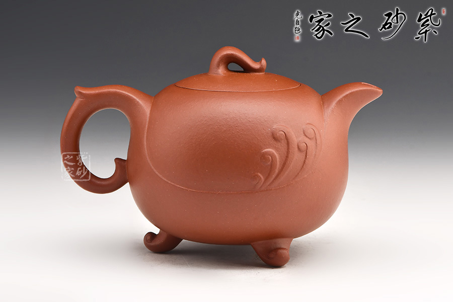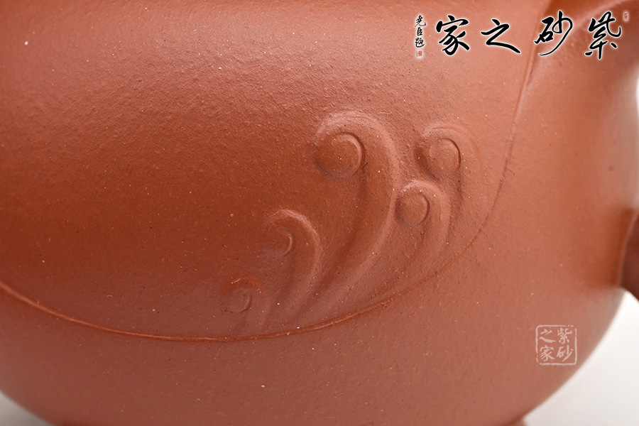 壺身圓潤(rùn),身蓋一體。底三乳足向外卷曲,牢牢支撐壺體。以簡(jiǎn)練的線條勾勒出波浪紋路,順暢柔美。壺嘴和壺把處在同一水平線上,相互對(duì)稱,優(yōu)雅大方。