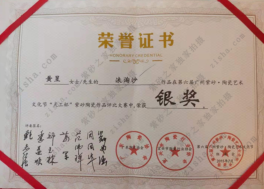 宜興紫砂,聞名遐邇,藝術(shù)殿堂,高深莫測(cè),“只有不畏艱險(xiǎn),勇于攀登崎嶇小道的人,才能到達(dá)光輝的頂點(diǎn)”,馬克思的話時(shí)時(shí)激勵(lì)著黃昱。在嚴(yán)師的教導(dǎo)下,加上自己刻苦鉆研,虛心好學(xué),深得名師的真?zhèn)鳌F陂g又多次得到省大師蔣小彥的指導(dǎo),壺藝制作水平日益提高,壺藝品味也不斷提升,且制壺簡(jiǎn)樸大方,內(nèi)涵豐富,個(gè)性鮮明,品味高雅,既繼承了中國(guó)傳統(tǒng)紫砂藝術(shù)的精華,又創(chuàng)造了強(qiáng)烈的時(shí)代氣息和整體美感。其作品多次在各個(gè)展覽會(huì)上獲獎(jiǎng),深得海內(nèi)外客戶的喜愛,是廣大紫砂愛好者收藏的寵兒。2011年,參加紫全手工比賽,獲得優(yōu)秀獎(jiǎng),并獲得高級(jí)技工證。在辛亥革命百年之際,與杭州西泠印社合作創(chuàng)作的《圓潤(rùn)壺》被香港大公報(bào)和臺(tái)灣國(guó)立國(guó)父紀(jì)念館永久收藏。2012年,《曼生葫蘆》,《潘壺》,《倒把西施》,《拋?zhàn)饓亍返榷嗉髌繁荒暇┘涡排馁u公司收藏。