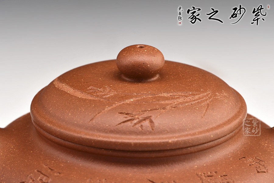 虛扁壺,降坡泥制作。壺體半圓形,從下至上逐漸變寬。壺流自壺肩一彎而出,壺把自壺肩下彎至壺身,與流相呼應(yīng)。壺肩平坦,蓋邊線略強(qiáng)于口線,正合國人天蓋地之理念。圓蓋,球形鈕,圈足底,視覺觀感上佳。