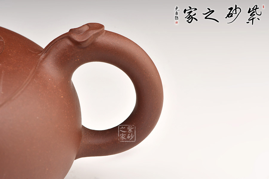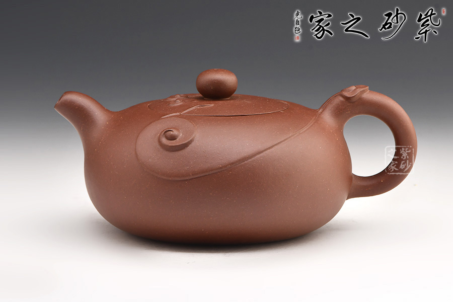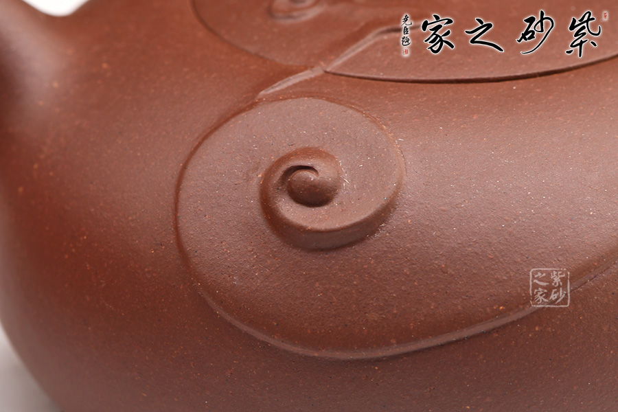 好運(yùn)連連紫砂壺:扁圓壺身,身蓋一體。圓珠鈕,一彎嘴,耳型把。身、蓋、把上皆裝飾有如意紋。如意朵朵,象征著好運(yùn)不斷,事事如意。
