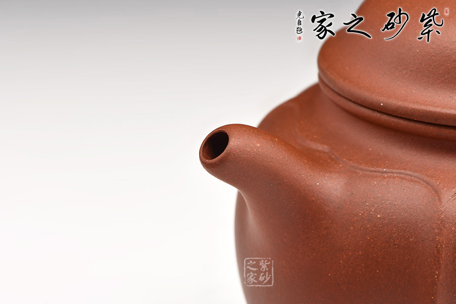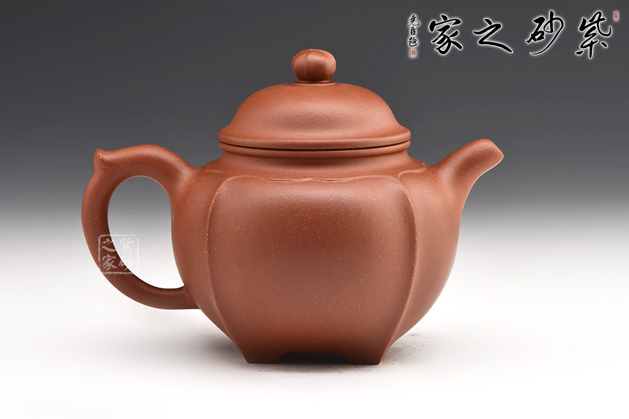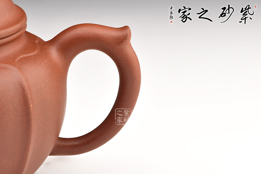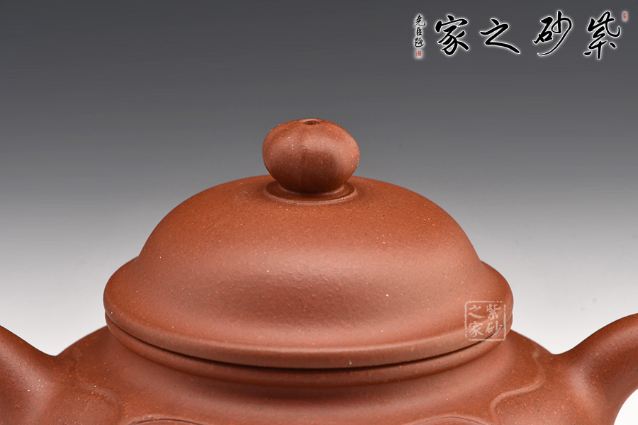 底呈犴門。壺身均勻分割成四塊,線條清晰。一彎嘴出水成股,耳型飛把飄逸瀟灑,子母線壓蓋設(shè)計,蓋面高聳,頂圓珠鈕亭立。