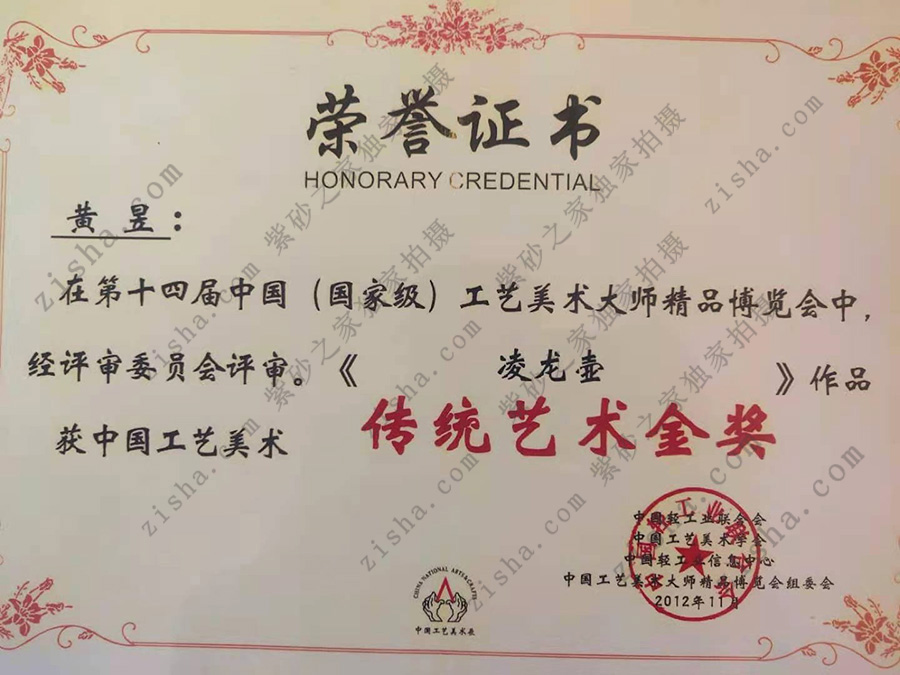 宜興紫砂,聞名遐邇,藝術(shù)殿堂,高深莫測,“只有不畏艱險,勇于攀登崎嶇小道的人,才能到達(dá)光輝的頂點”,馬克思的話時時激勵著黃昱。在嚴(yán)師的教導(dǎo)下,加上自己刻苦鉆研,虛心好學(xué),深得名師的真?zhèn)鳌F陂g又多次得到省大師蔣小彥的指導(dǎo),壺藝制作水平日益提高,壺藝品味也不斷提升,且制壺簡樸大方,內(nèi)涵豐富,個性鮮明,品味高雅,既繼承了中國傳統(tǒng)紫砂藝術(shù)的精華,又創(chuàng)造了強(qiáng)烈的時代氣息和整體美感。其作品多次在各個展覽會上獲獎,深得海內(nèi)外客戶的喜愛,是廣大紫砂愛好者收藏的寵兒。2011年,參加紫全手工比賽,獲得優(yōu)秀獎,并獲得高級技工證。在辛亥革命百年之際,與杭州西泠印社合作創(chuàng)作的《圓潤壺》被香港大公報和臺灣國立國父紀(jì)念館永久收藏。2012年,《曼生葫蘆》,《潘壺》,《倒把西施》,《拋尊壺》等多件作品被南京嘉信拍賣公司收藏。