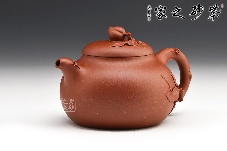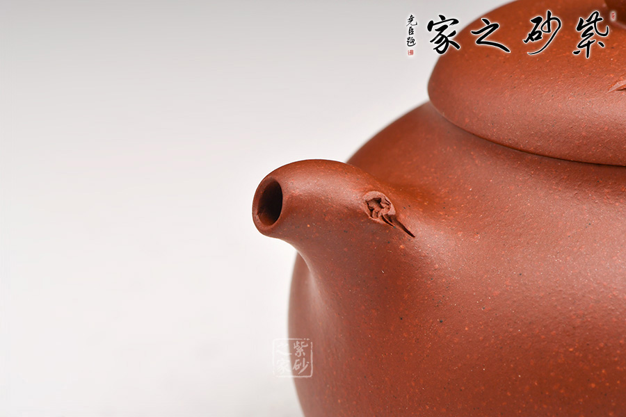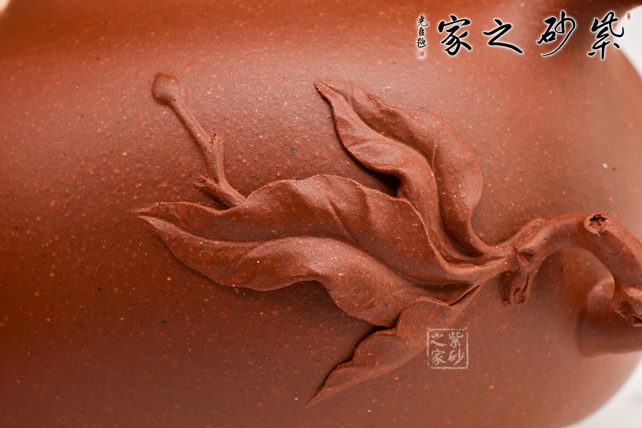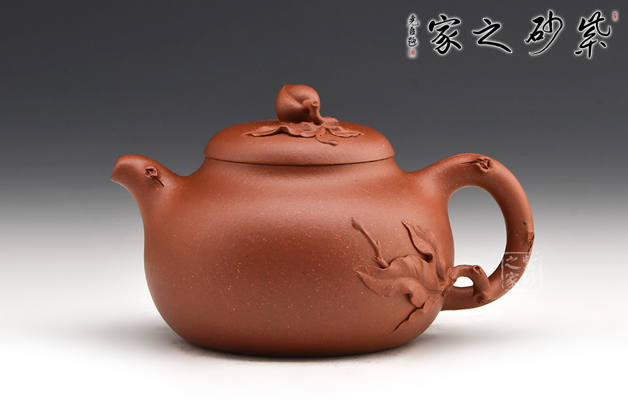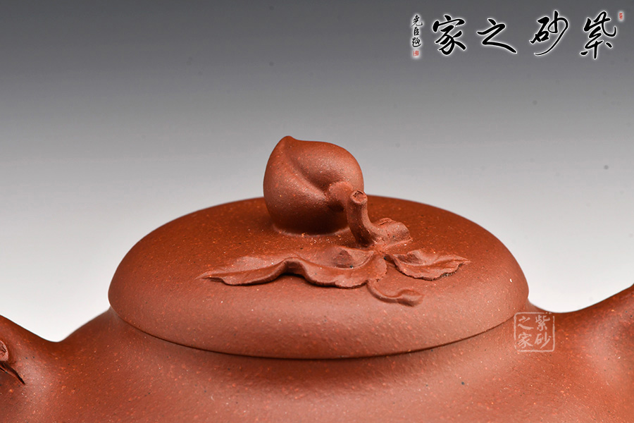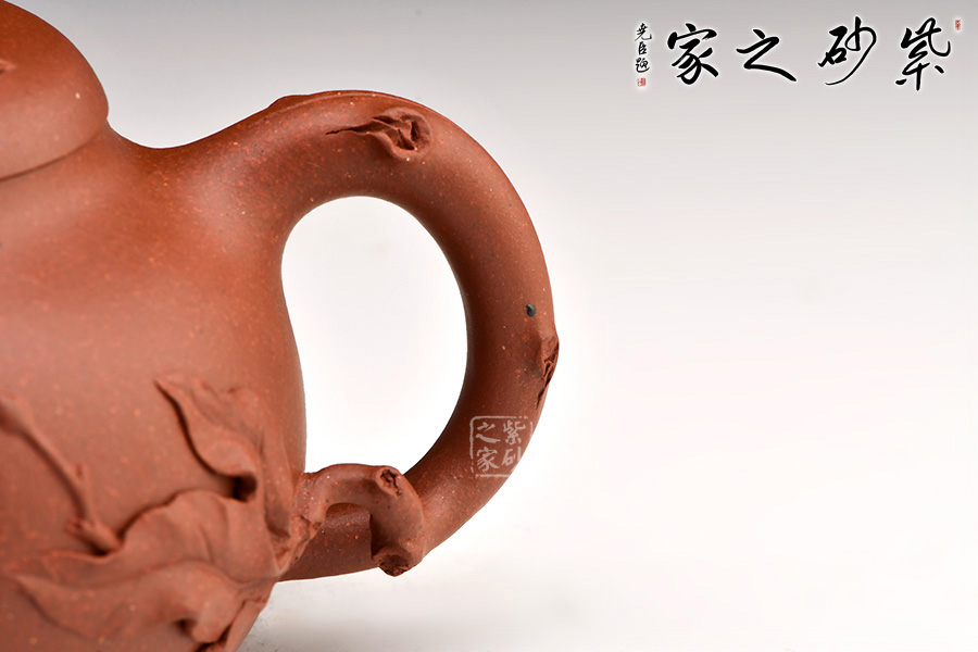 桃的元素在紫砂中不少見,它所象征的是祝福長壽之意,傳說得壽桃者必能福壽盡享,長命百歲。錢菊萍老師以桃為題制此壺。壺身碩大豐滿猶如紅桃般,線條無論從哪個角度看,均成拋物線狀,圓潤飽滿,惹人喜愛;蓋上豎一小桃為鈕,折枝相連;桃枝為把,曲折有度;壺嘴竹節(jié)設(shè)計,有“祝?!敝猓瑝匕烟幱刑胰~迎風(fēng)飛揚,大有托著小桃乘風(fēng)而去、飄飄成仙之勢。此作形制自然美觀,又寄托情感,乃不可多得的精品之作!