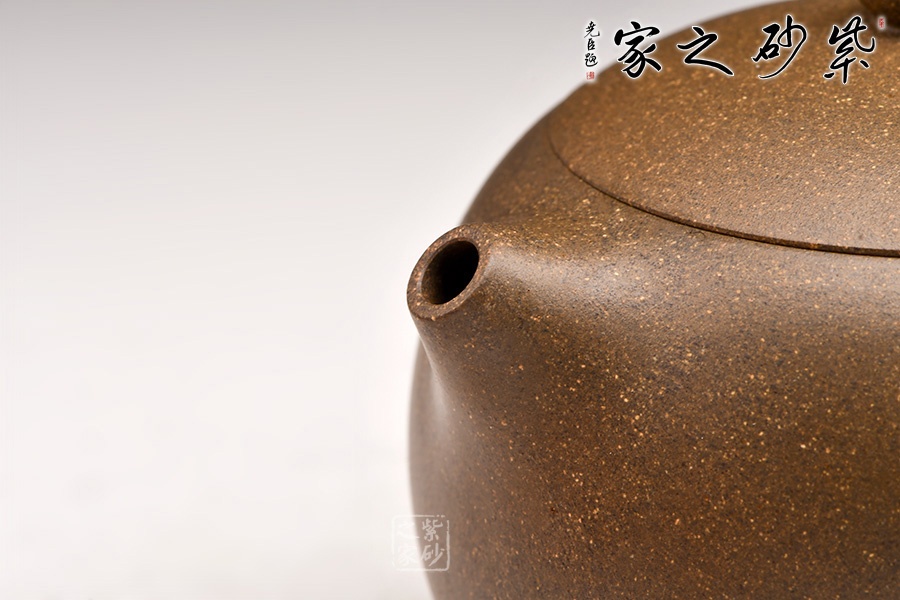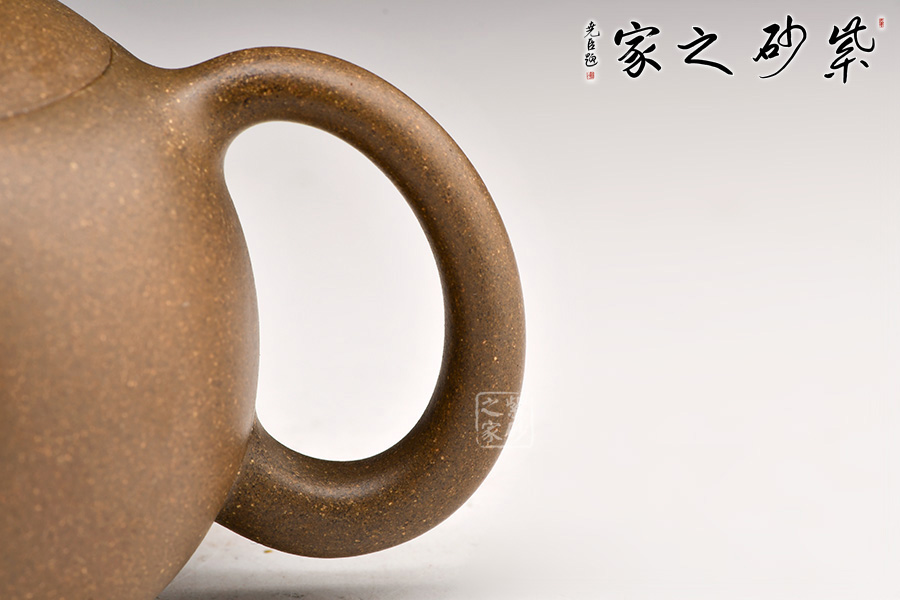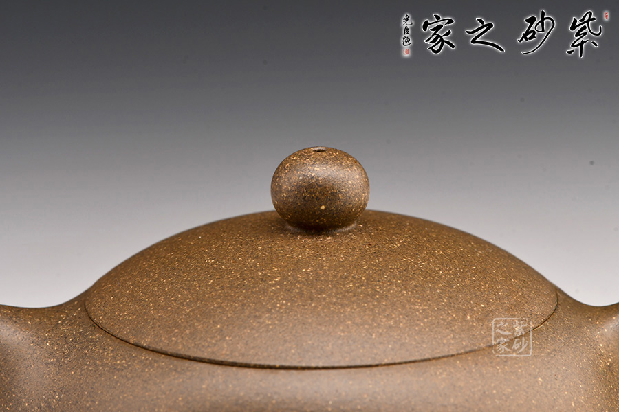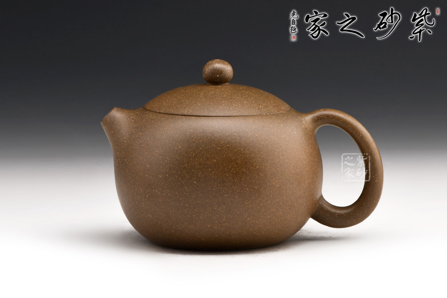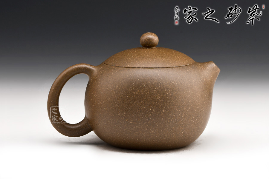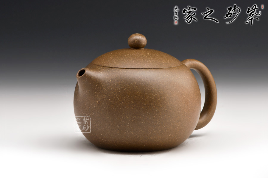 西施壺是紫砂壺器眾多款式中最經典、最傳統、最受人喜愛的壺型之一。此壺為青段西施壺,胎質細致,古樸敦實,質堅潤澤。壺身圓潤,嵌蓋,短嘴,倒把,憨態(tài)可掬,實為品茗把玩的佳品。此壺型壺蓋與壺身結合為圓球體,壺蓋上有圓球形壺鈕襯托,再加上特殊的倒把與小短的壺嘴,就形成了世人喜愛的西施壺,西施壺看似簡約,實為嚴謹,好似渾然天成。