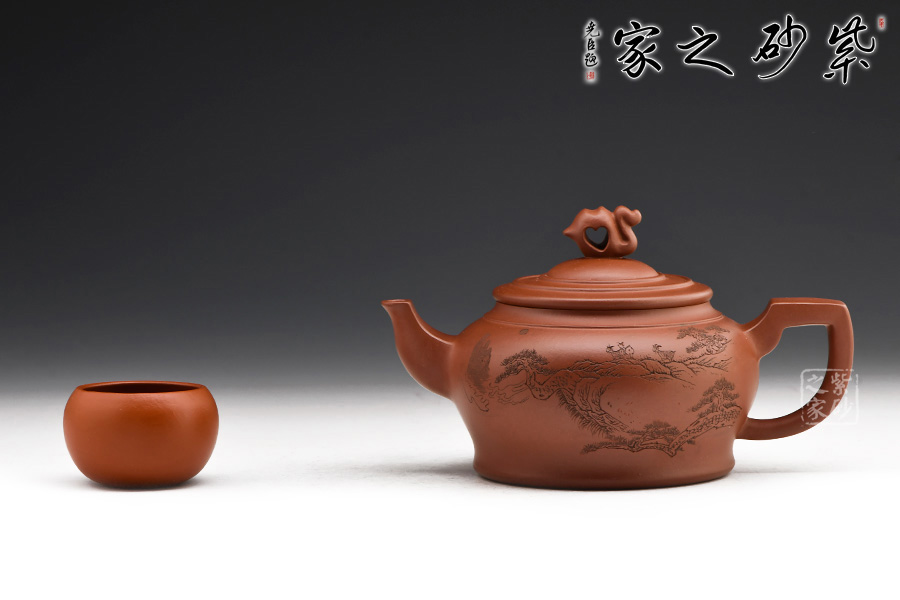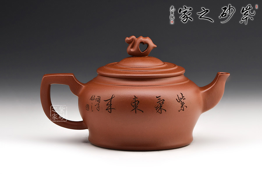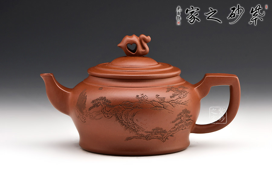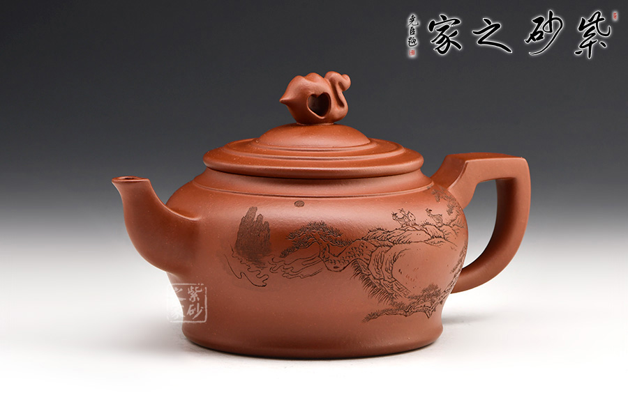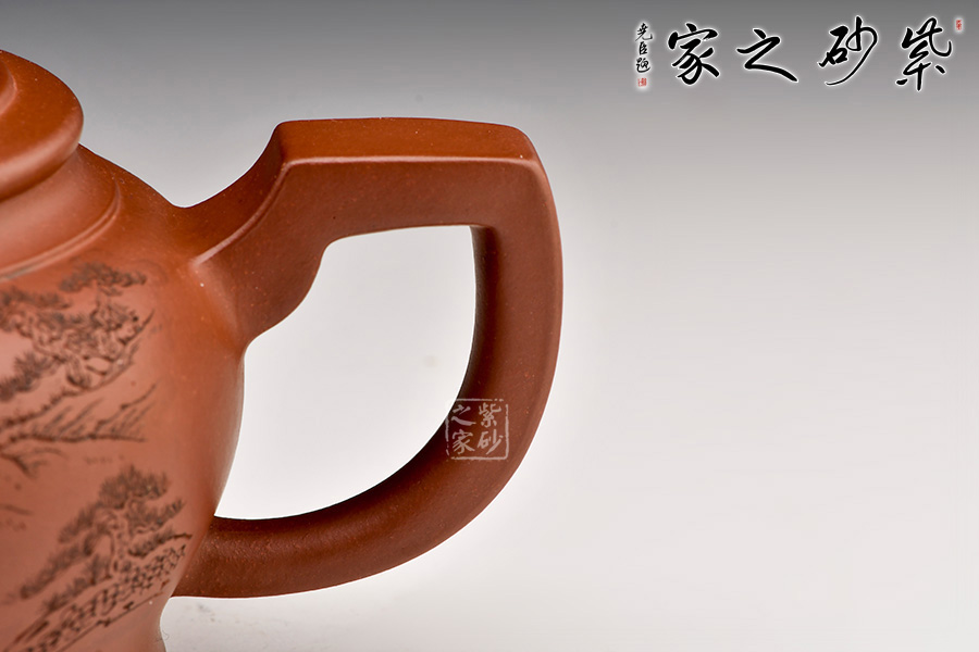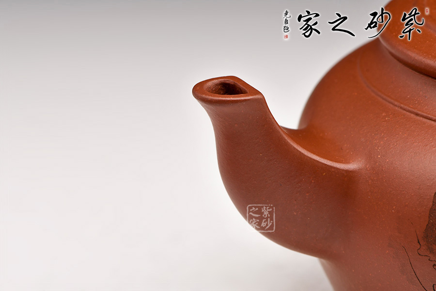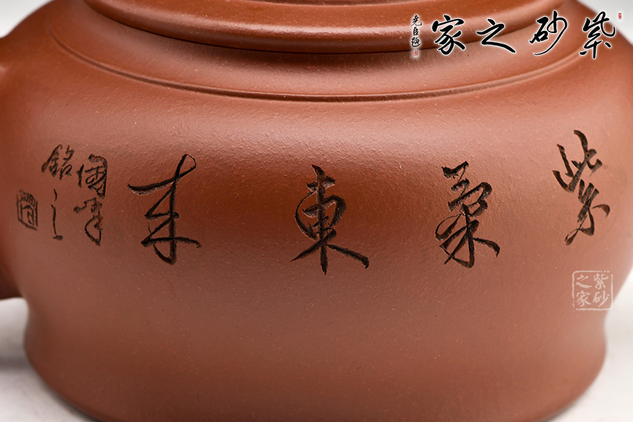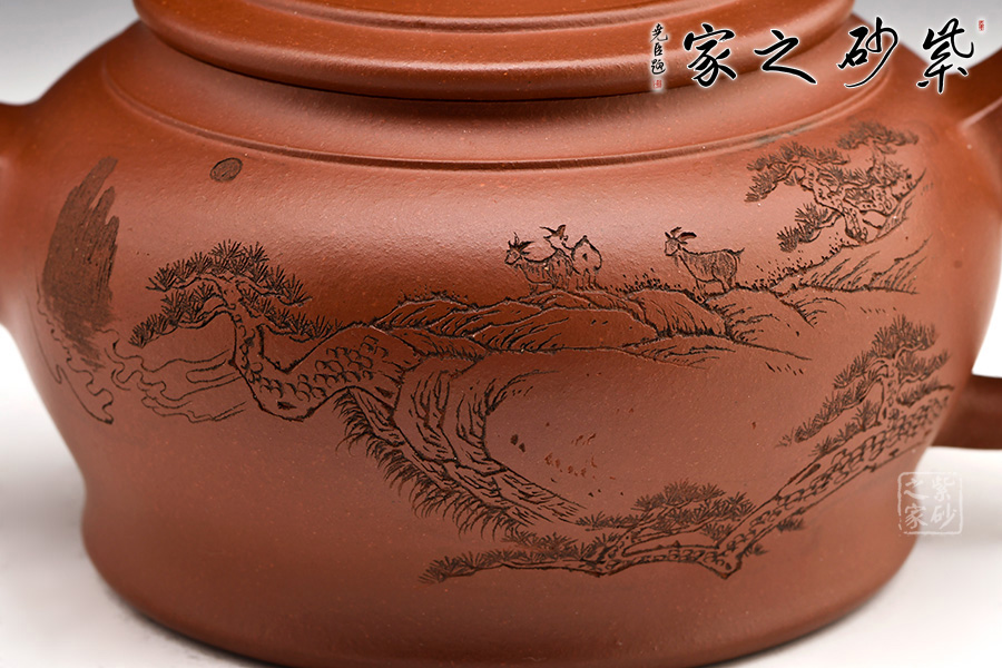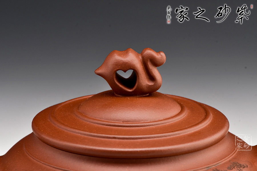 整款壺器型端莊,線條流暢簡潔,壺身腹鼓,彎流胥出,壺把隨身勢,壺嘴、壺把方圓相融,壺蓋幾條圈線平行流暢,以駱駝為壺鈕,壺鈕有心形鏤空,可見作者巧思,壺鈕與壺蓋相互映襯,如駱駝行走在連綿起伏的沙漠之上,與主題相合。雙面刻繪相互呼應(yīng)“紫氣東來”,整款壺線條簡潔而不失豐富的變化,值得藏用!