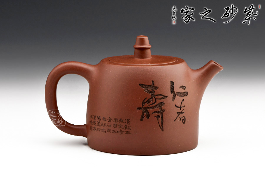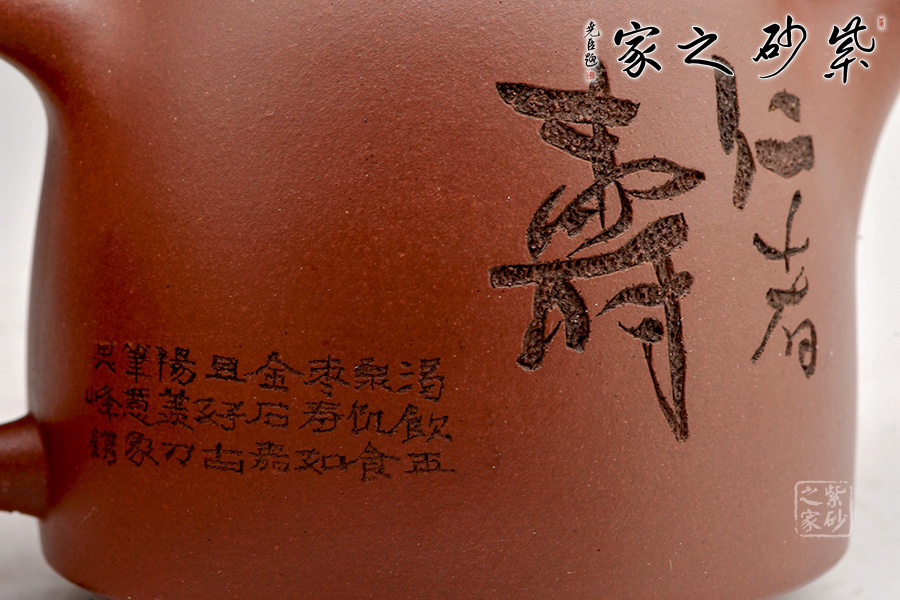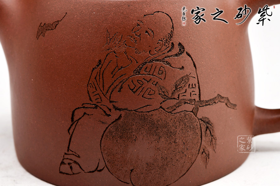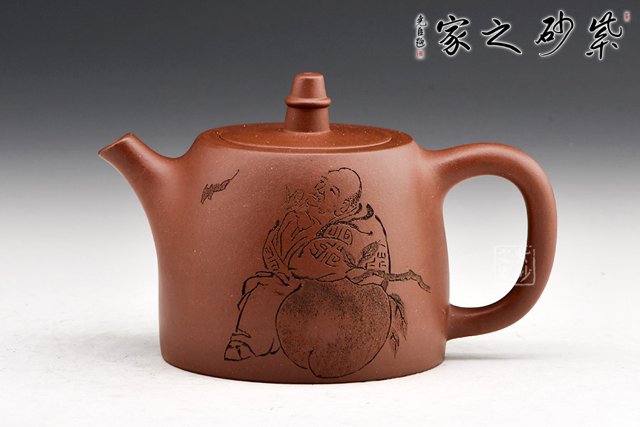 壺身造型規(guī)整,平嵌蓋,與壺融為一體。線面轉(zhuǎn)換周正舒坦、色調(diào)雅合,技藝嚴(yán)整,風(fēng)格之敦樸幾無(wú)可挑剔。從多方面詮釋了雄健而嚴(yán)謹(jǐn),流暢而規(guī)矩,古樸而典雅、工精而秀麗。壺身刻繪“仁者壽”,及老壽星、壽桃與蝙蝠,福壽雙全,寓意極好,值得用藏。